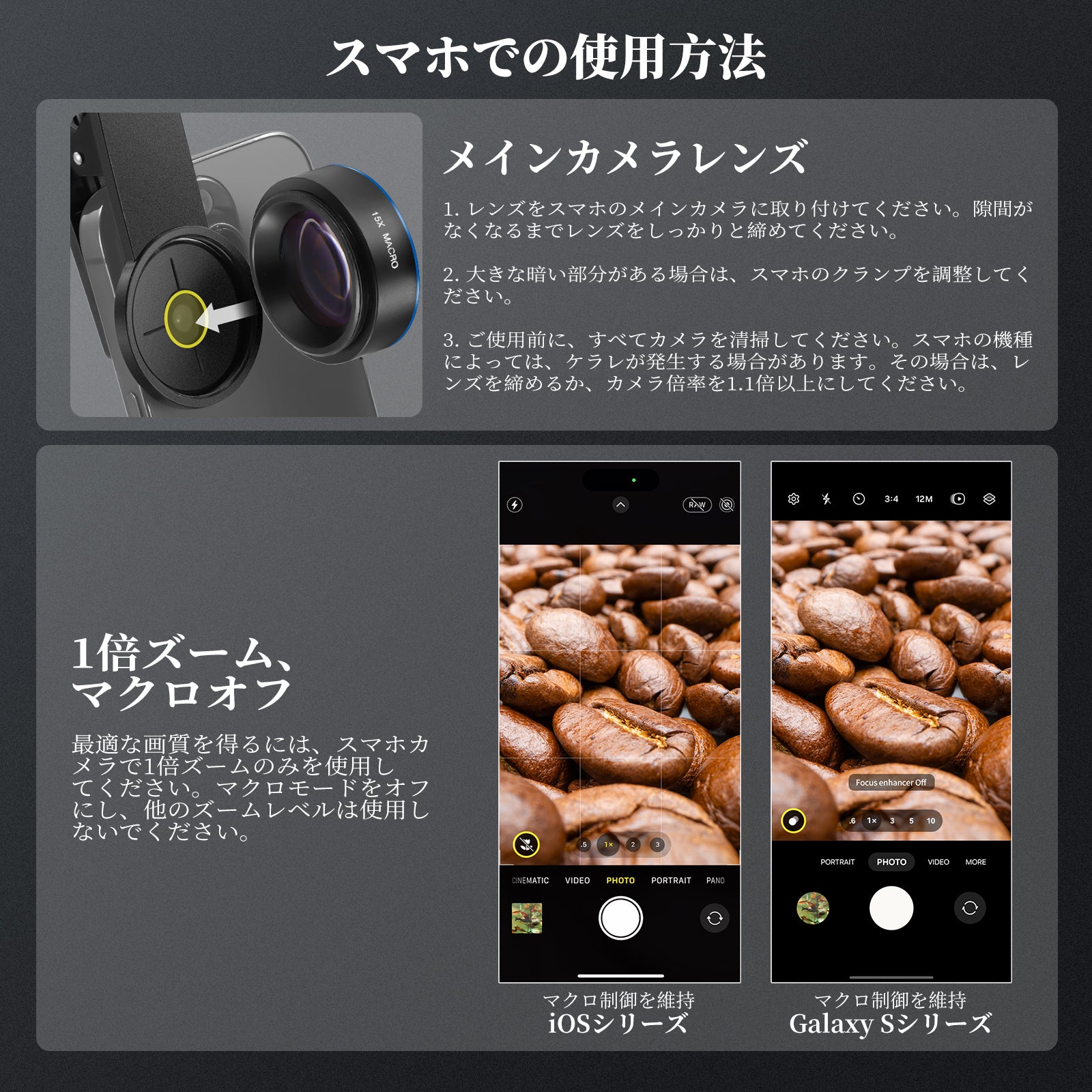 【ご注意】ご使用前に、スマホのすべてカメラをクリーニングしてください。機種によってはケラレが発生する場合があります。その場合は、マクロモードを無効にし、レンズを絞り込み、カメラ倍率を1.1倍以上にズームしてください。
