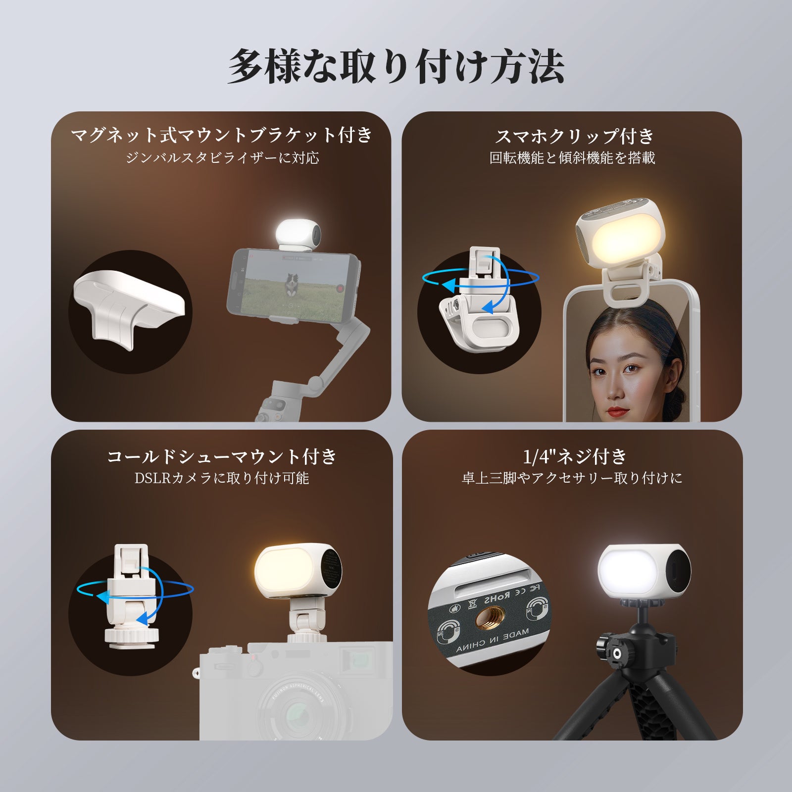 • 【マグネット式で設置簡単】ミニLEDライトは、OSMOモバイルジンバルや磁気プレート付きのZHIYUNスタビライザーに対応。強力マグネット式で各種金属面に瞬時に吸着固定。ワンタッチで確実に設置でき、手ブレのない安定した動画収録を実現します。