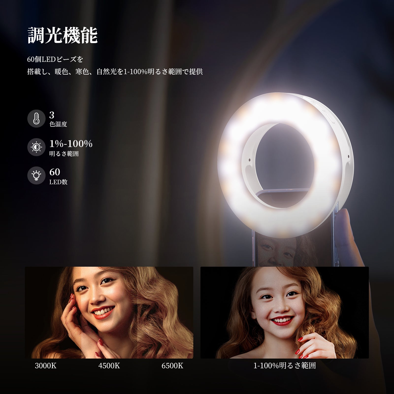 - 【精密な調光機能】N28 自撮りライトは60個の高品質LEDを搭載し、暖色・寒色・自然光の3色モードと1%~100%まで細やかな調光機能で、あらゆる肌のトーンを美しく整え、正確な色彩再現を実現します。TikTok/YouTube動画制作、日常の動画収録、ライブ配信、メイクアップ撮影まで、多彩なシーンで活躍します。
