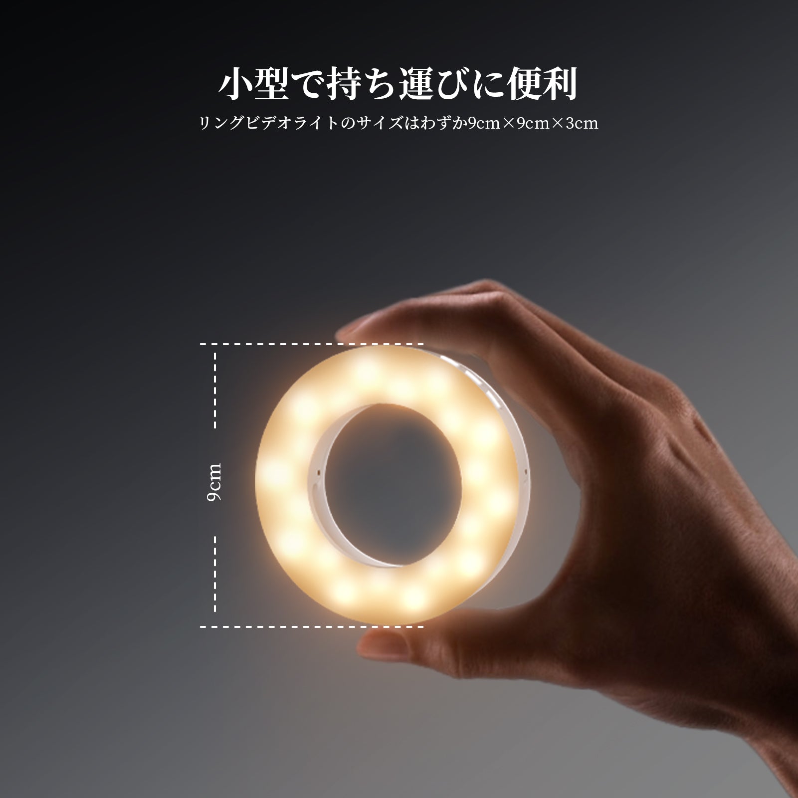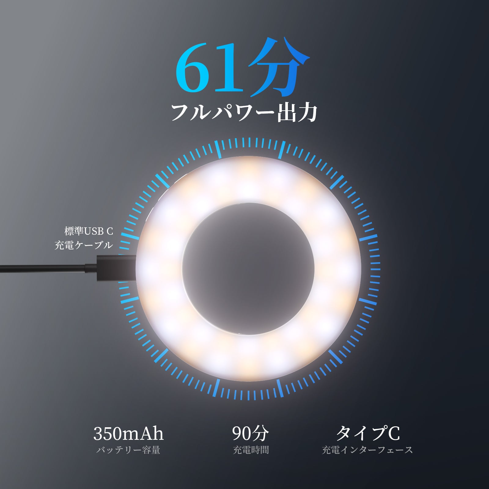 【USB充電対応】小型リングライトは、350mAhバッテリー内蔵、最大輝度で約1時間の連続使用が可能。スマートフォンでの写真撮影や動画収録時、安定した補光を提供します。コンパクトながら十分な駆動時間を実現し、外出先でのコンテンツ制作をしっかりサポート。