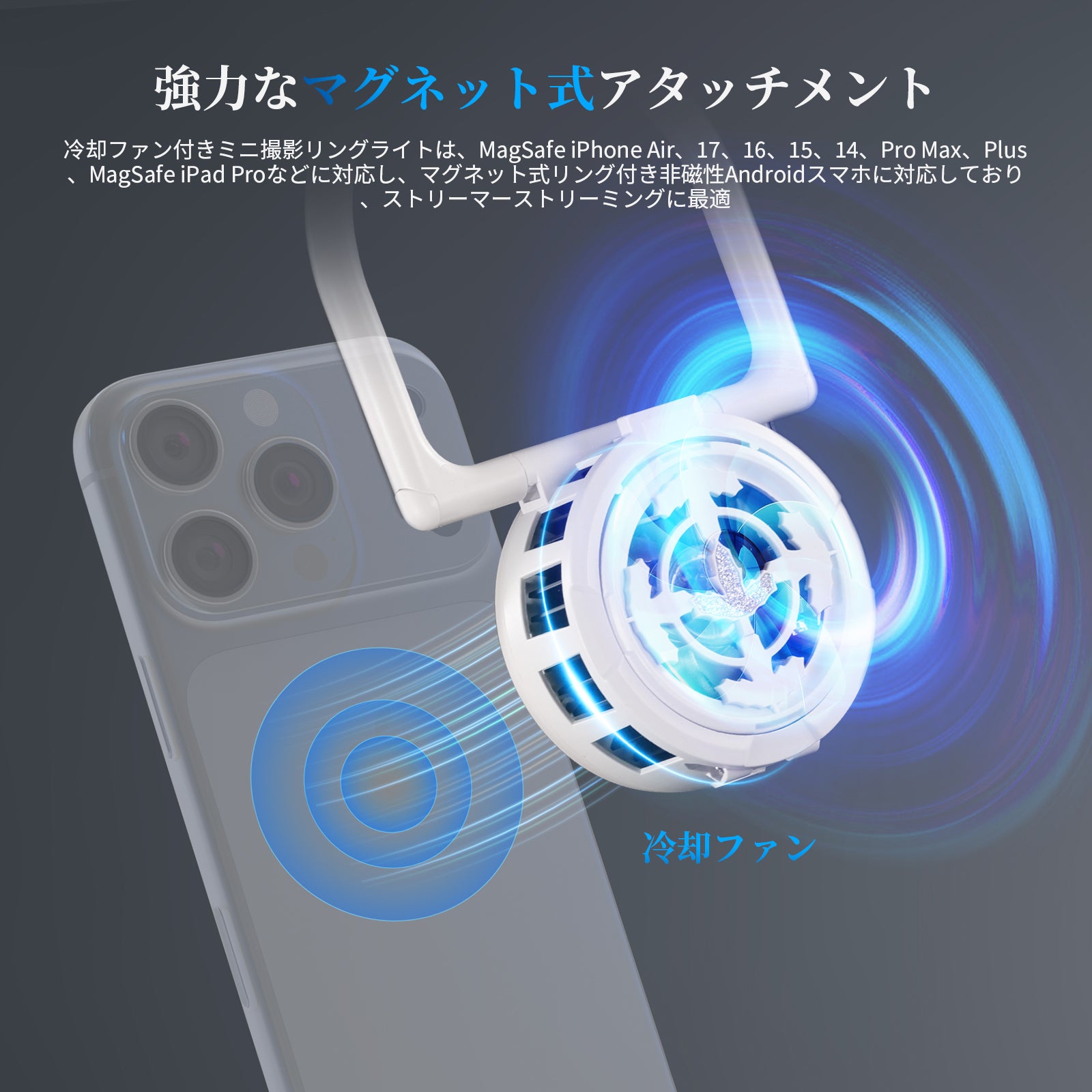 - 【マグネット式で設置簡単】ミニLEDライトは、MagSafe対応のiPhone 17/16/15/14 Pro Max PlusシリーズやiPad Proはもちろん、磁気リング装着済みのAndroidスマートフォンにも対応。付属の磁気リングでノートPCやデスクトップに簡単取り付け可能。リングライトは水平方向に360°回転、垂直方向にチルト調整が可能で、フロントカメラとリアカメラの両方で柔軟に使用できます。