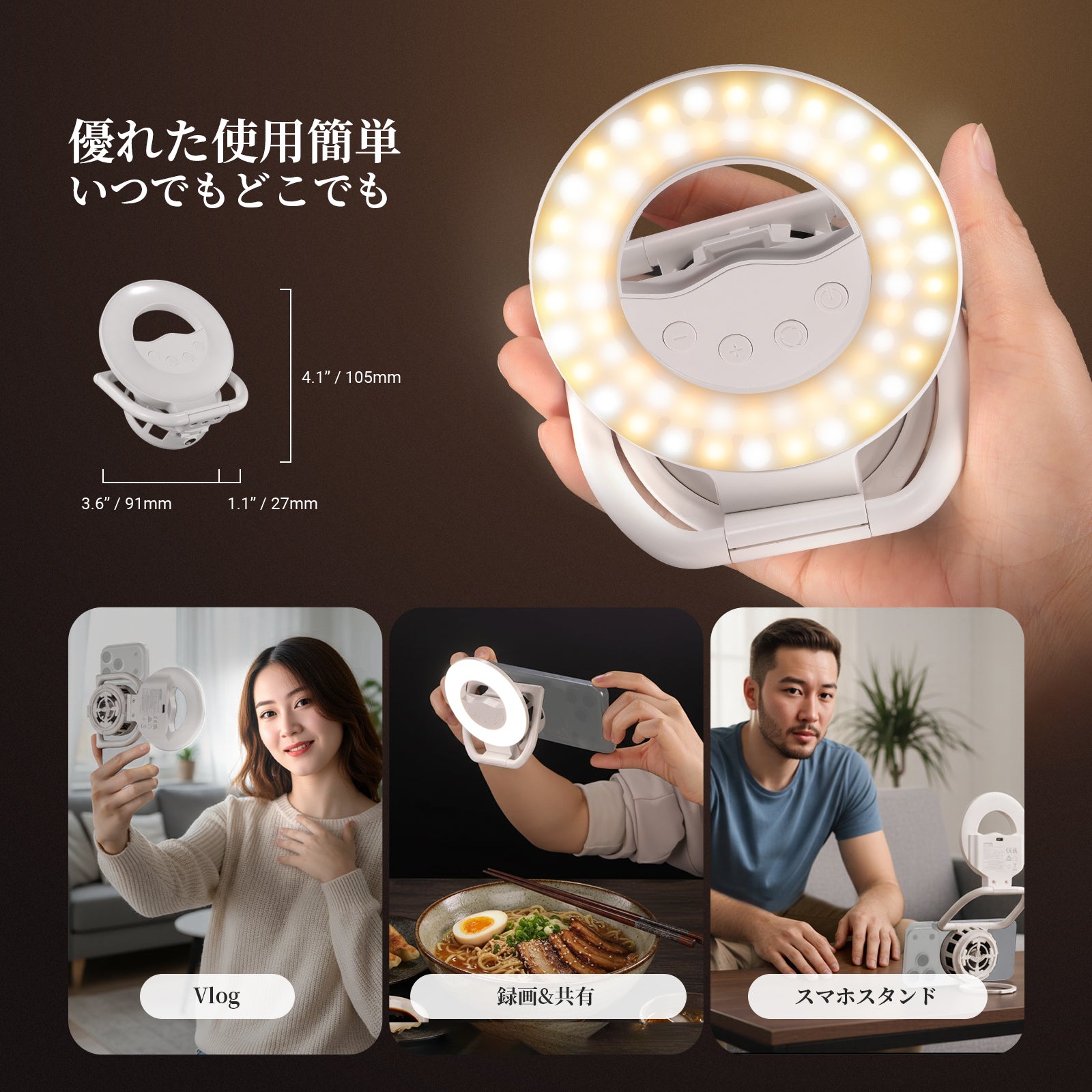 - 【小型軽量&ポータブル】N35 スマホ用LEDリングライトは、わずか10.5×9.1×2.7cm、重量約96gの超コンパクト設計。60個のLEDが肌を美しく照らす柔らかな光を提供し、メイクアップ動画や旅行Vlog制作にぴったりの照明アクセサリーです。YouTube/TikTok動画制作、ポッドキャスト収録、Zoom会議、ビデオ通話、ウェブカメラ配信など、多様なシーンで活躍します。