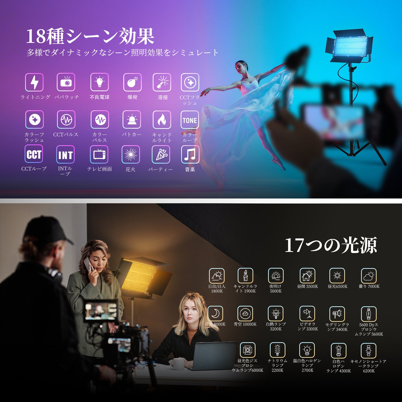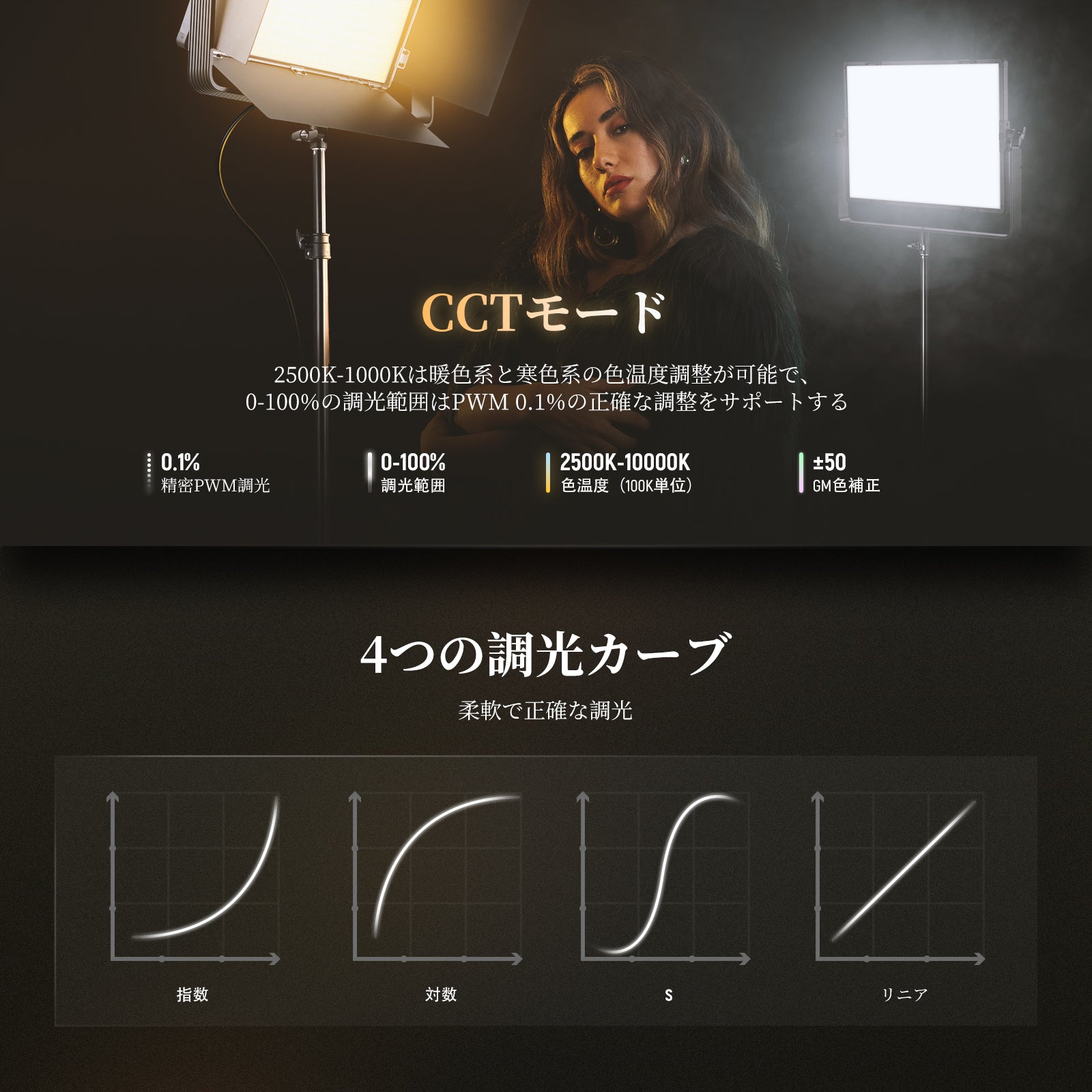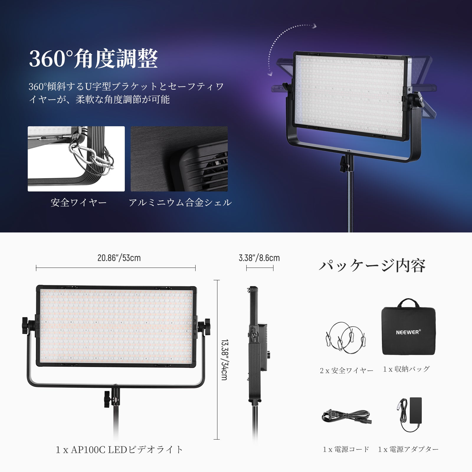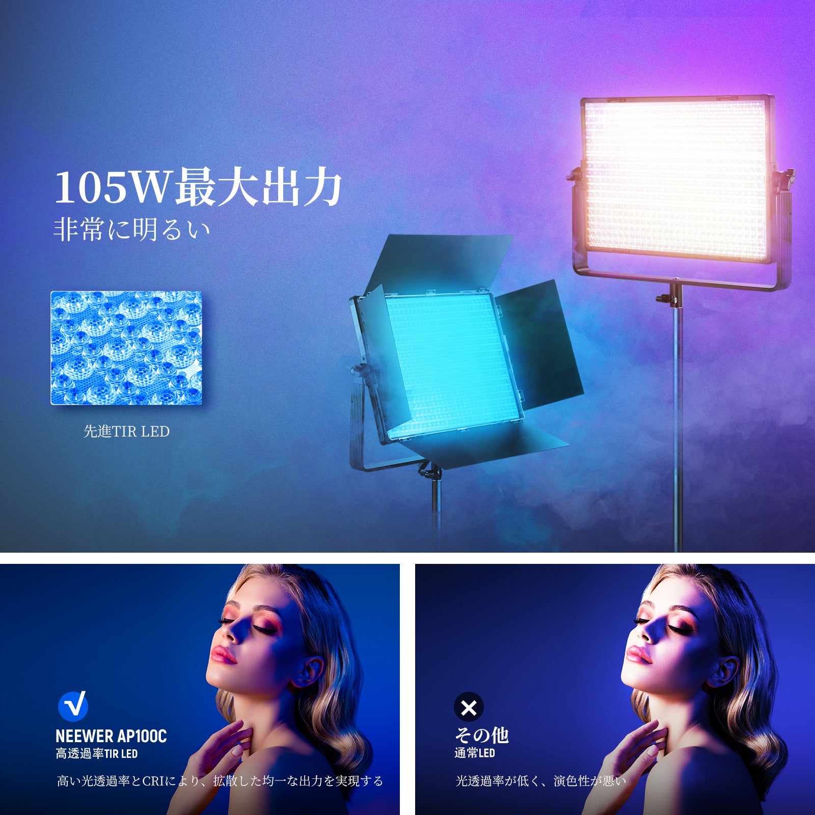 - 【プロ級光質&高出力性能】NEEWER AP100C RGB パネルライトは、先進的なLED光学設計と高透過率TIRレンズモジュールを搭載し、高品質で透過性に優れた光を実現します。105Wの高出力と1200個の高品質LEDチップにより、最大31,500Lux/0.5mという高照度を実現します。CRI96+/TLCI97+の超高演色性で被写体の自然な色再現を可能にします。2500K~10000Kの広域色温度調整機能で、暖色から寒色まで瞬時に切替ます。YouTube/TikTok動画、商品撮影、インタビュー収録、ポートレート写真、映画制作など、プロ撮影から個人クリエイターまで幅広く対応します。
