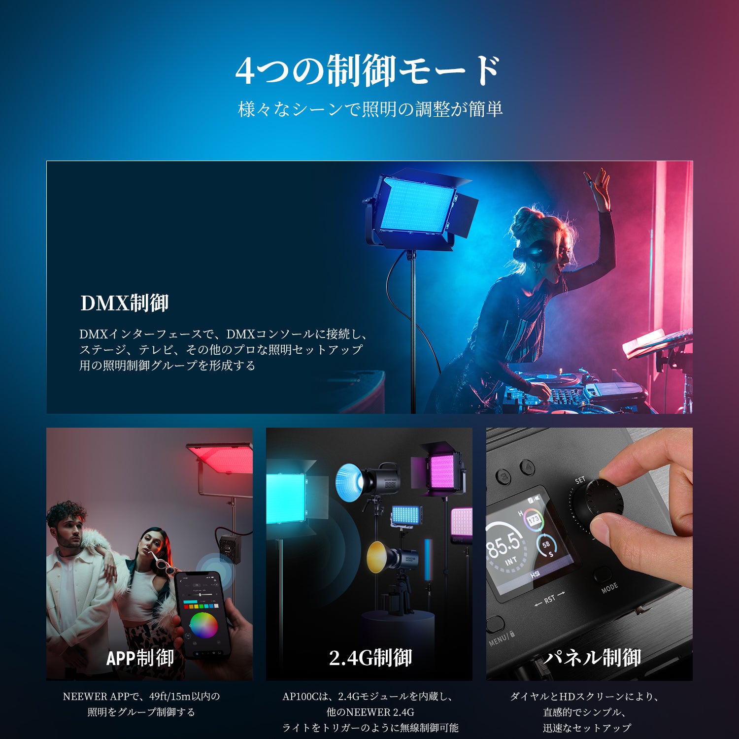 - 【APP/2.4G/パネル/DMX制御】NEEWER AP100C RGBライトはAPP/2.4G/パネル/DMXなど4つの制御方法を搭載します。NEEWER APPによる無線制御と複数ライトのグループ管理が可能です。内蔵2.4Gモジュールにより、異なるライトモデル(SL90 PRO、RGB1、RGB1200、MS60C、MS60B、MS150B、FS150B、BH30S、CB60Bなど)のマスタースレーブ制御を実現。パネル操作で直感的にパラメーターを表示・調整。5ピンDMXポートを装備し、DMXコンソールに接続することで、複雑なマルチライトセットアップに対応します。