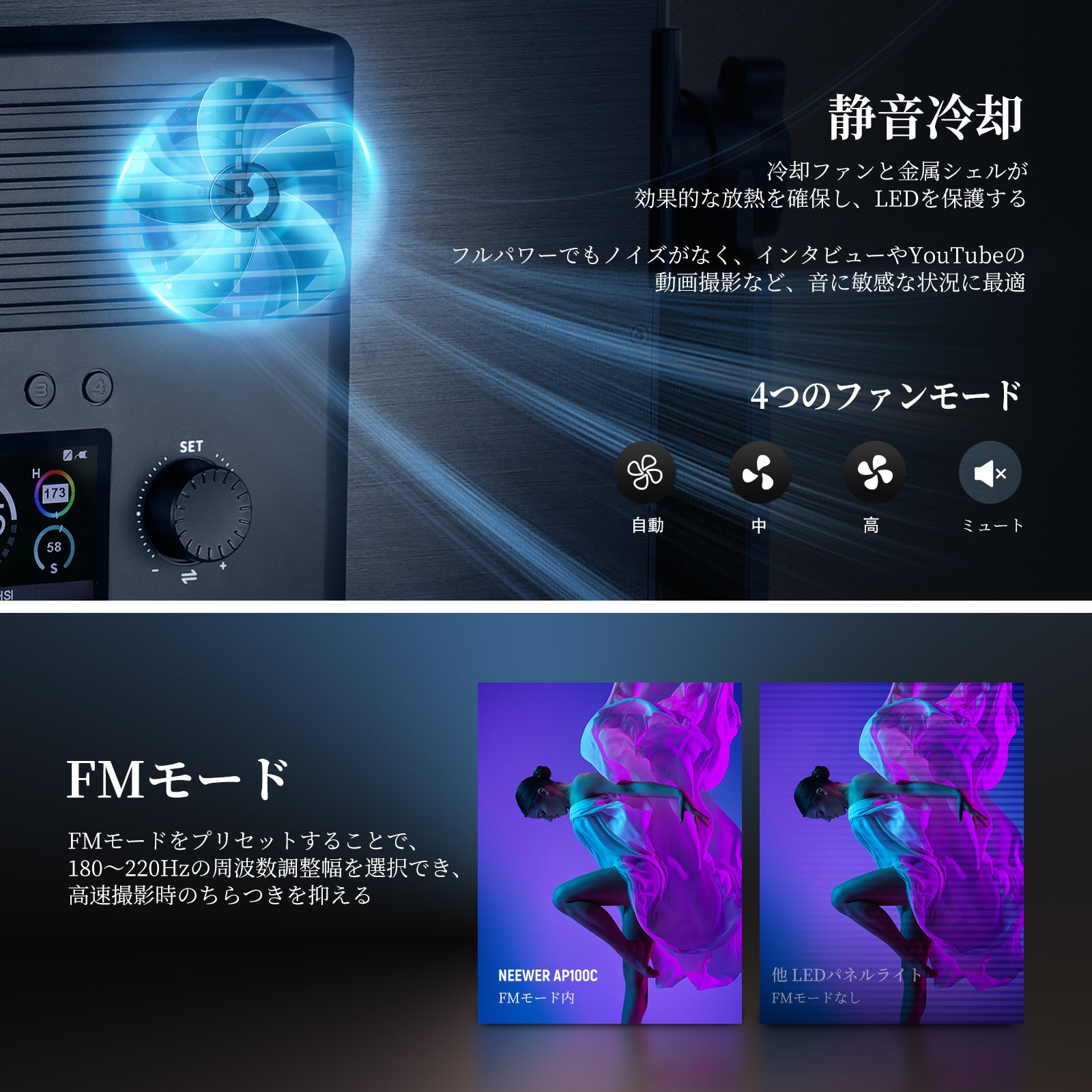 - 【静音冷却ファン & フリッカーフリー】内蔵の高品質冷却システムは、スマート/中速/高速/静音の4モード搭載。ライトの性能を最適に維持し、効率的な放熱で寿命を延長します。ファンは全速時でも静音性を維持し、音声収録環境に最適。スマートFMモードがライトの出力周波数を自動調整し、高速撮影時のフリッカーフリーを実現します。