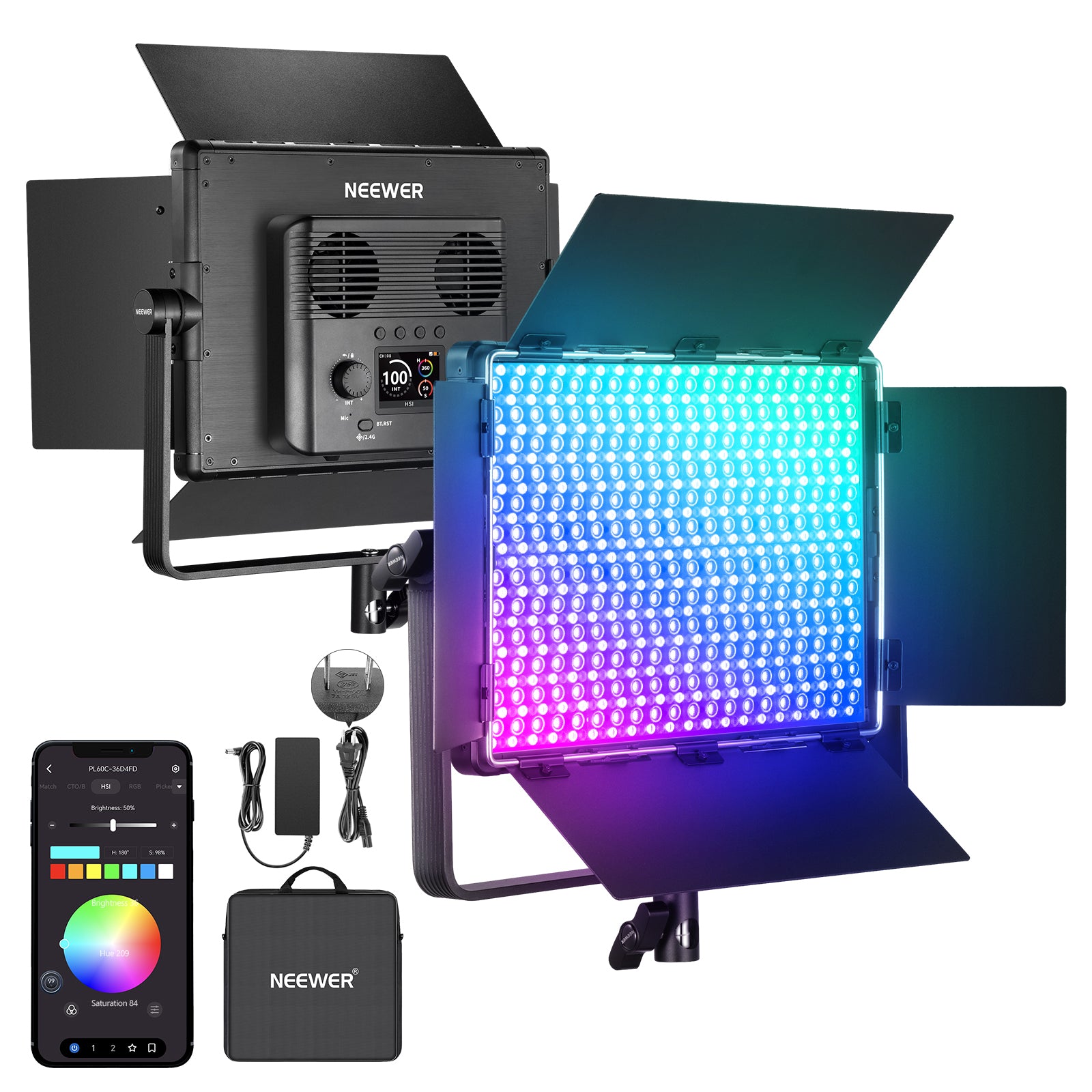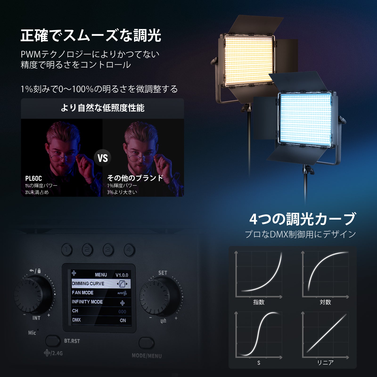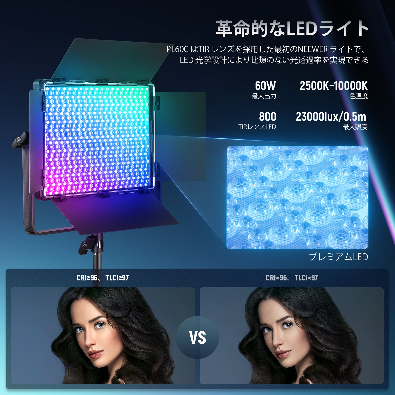 【RGBCWフルカラーLEDパネルライト】800個のプレミアムLEDを搭載したNEEWER PL60CフルカラーRGBビデオライトは、最大出力60W、照度6400lux/1m 23000Lux/0.5mで明るい照明を提供します。PWM技術により、4つの正確な調光カーブで、0~100%の調光範囲で1%の正確な増分を保証します。CRI 96+、TLCI 97+で忠実な色再現ができます。2500K-10000Kの色温度と0-360°の色相角度は、ビデオ録画撮影ストリーミングポッドキャスティング写真撮影のための創造的な写真撮影照明を提供します。