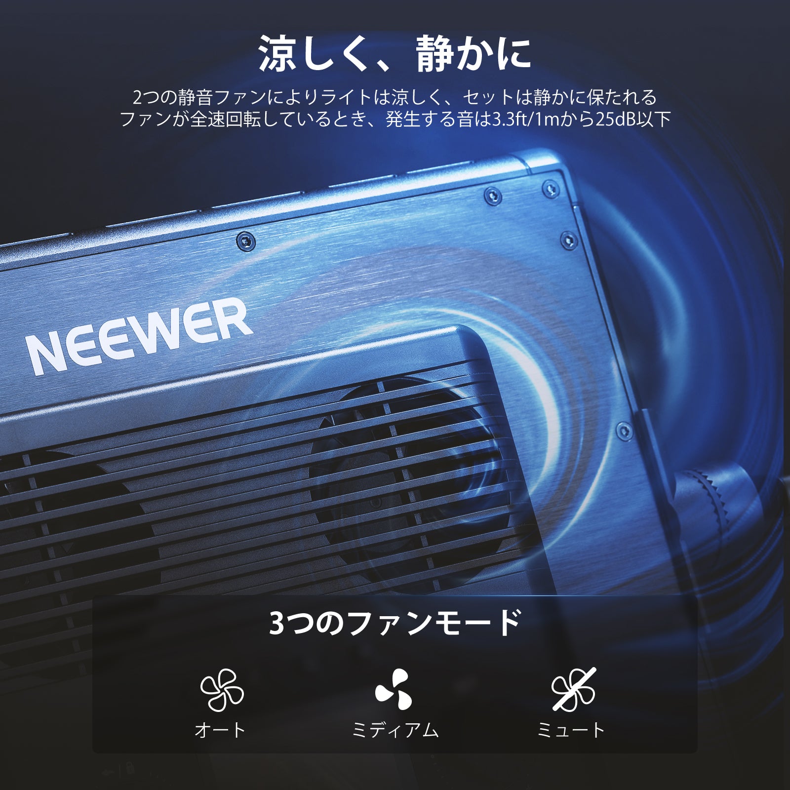 【2.4G/APP/DMX/パネル制御モード】異なるシナリオのために、ライトは4つの照明制御モードをサポートしています。内蔵の2.4Gモジュールにより、同時に1つのライトグループ(SL90 RGB1 RGB C80 RGB 1200 MS60C MC60B MS150B FS150B BH30S CB60Bを含む)を制御できます。NEEWER APPを使えば、スマートフォンで隠された機能を解除できます。ライト本体のカラーLCDパネルに必要な情報が表示されます。5ピンDMXポートでDMXコンソールに接続でき、複雑なステージ照明のセットアップができます。