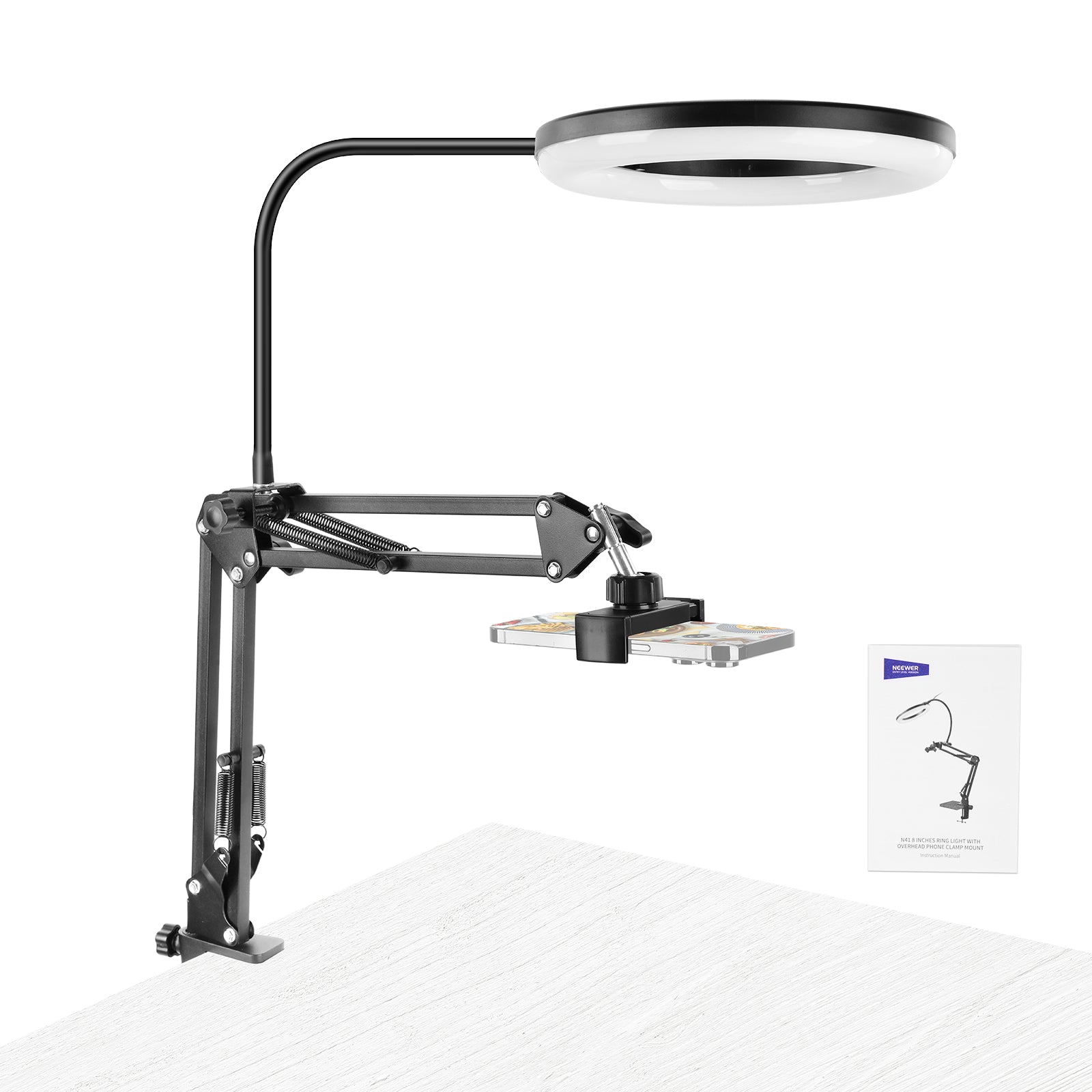 - 【柔軟な位置調整】関節式デスクスタンド付きリングライトは、最大約108cmまで伸縮自在。上下・左右に角度を自由に調整でき、厚さ2.16インチ(約5.5cm)までのデスクにしっかり取り付け可能です。ビデオ通話やポッドキャスト収録、ソーシャルメディア動画、メイクアップ撮影など、スマートフォンカメラを使った多様なシーンで、理想的な照明を手元に届けます。