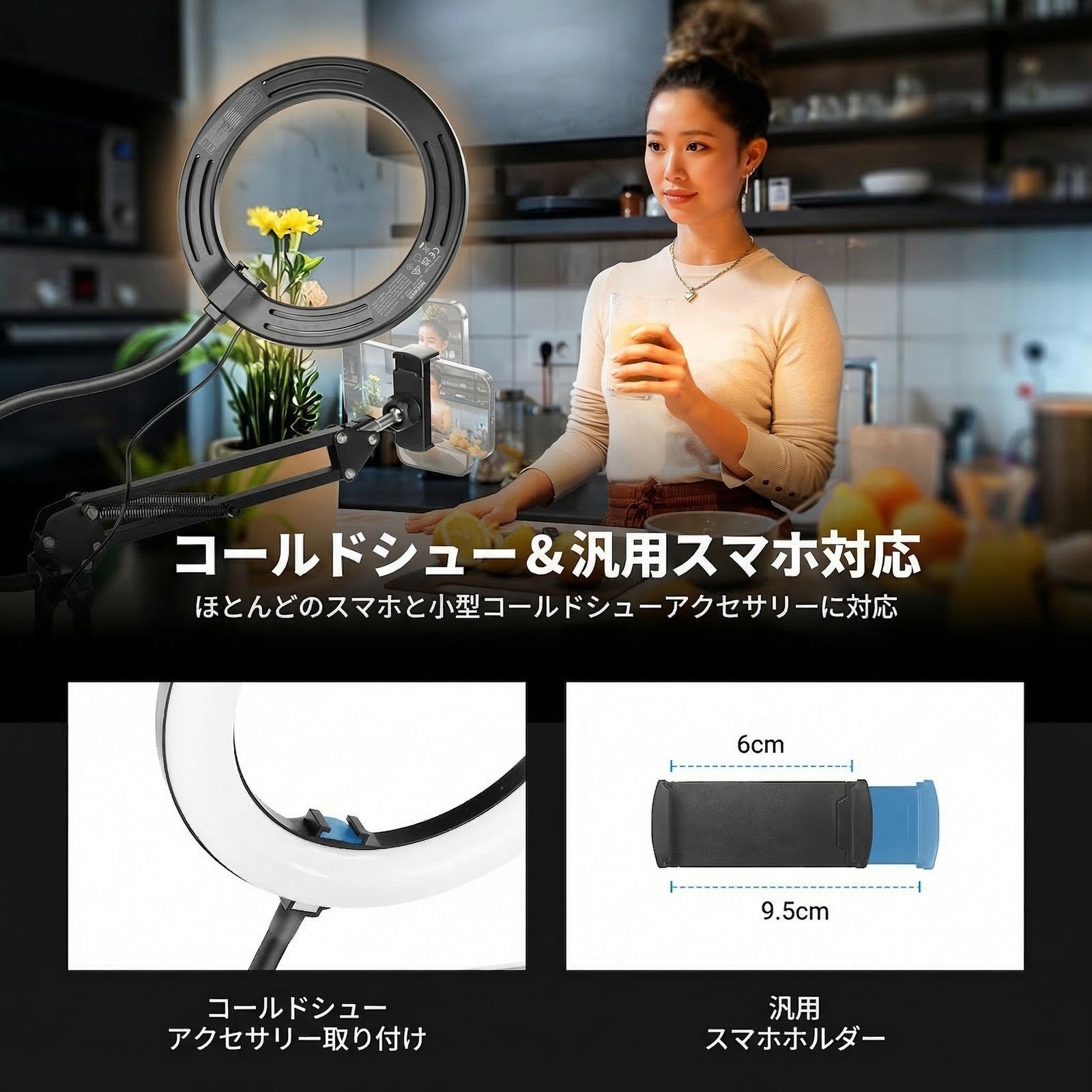 【ユニバーサルスマホホルダー搭載】円形LEDライト中央にはフレキシブルなスマートフォンホルダーを設置。iPhone 17/16/15 Pro Max/Plus、Galaxy S25/S24 Ultraなど、幅広い機種に対応。スマートフォンでの自撮り、動画収録、スタジオ撮影、コンテンツ制作まで、多様なシーンで活躍します。付属のBluetoothリモコンでワイヤレスシャッター操作が可能。