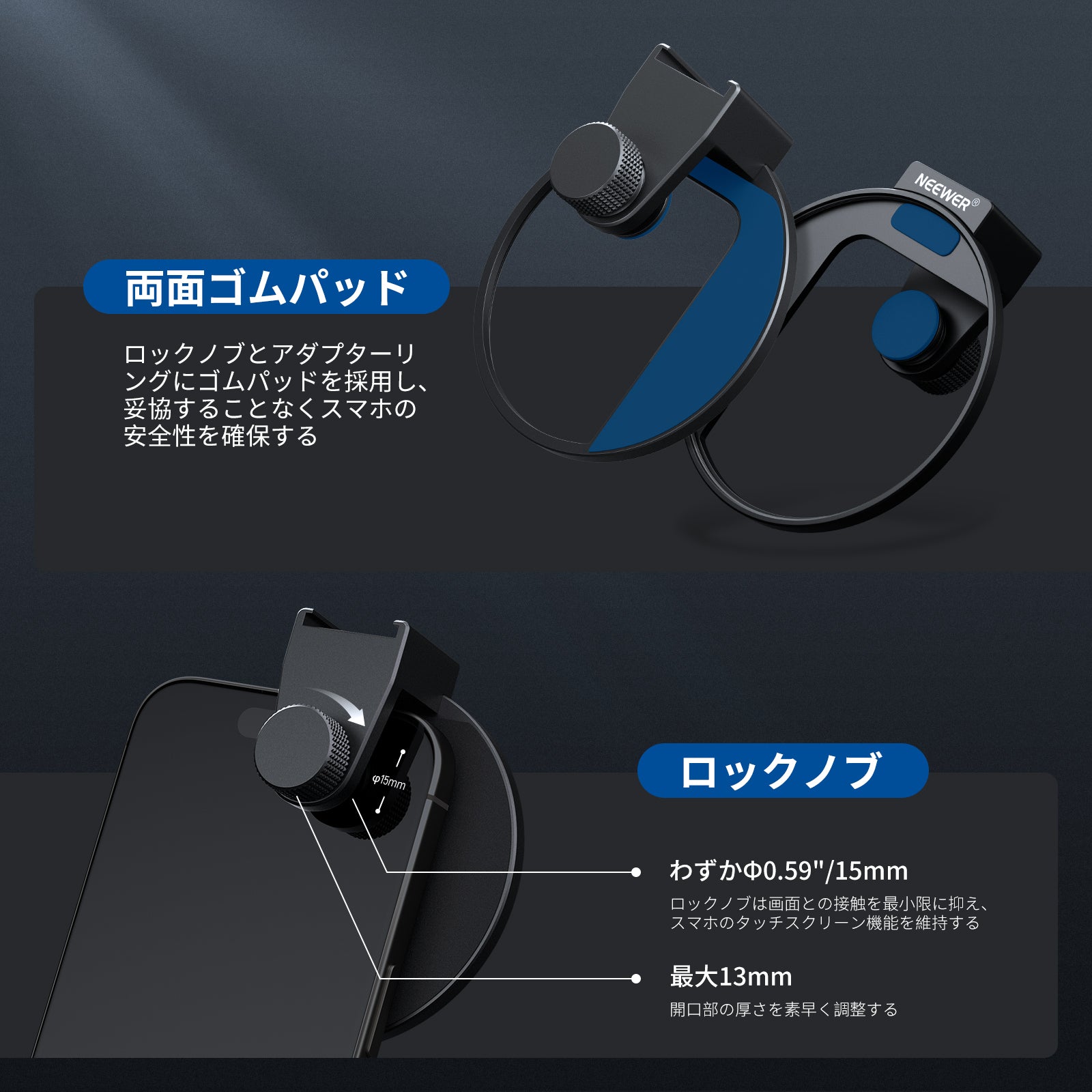- 【ゴムパッド付きの丈夫なフレーム】クリップフレームは頑丈なアルミニウム合金製で、ロックノブとアダプターリングには両面ゴムパッドが付いており、スマホを安全かつ確実に保ちます。暗い角が気になる場合は、アダプターリングを使用して調節できます。