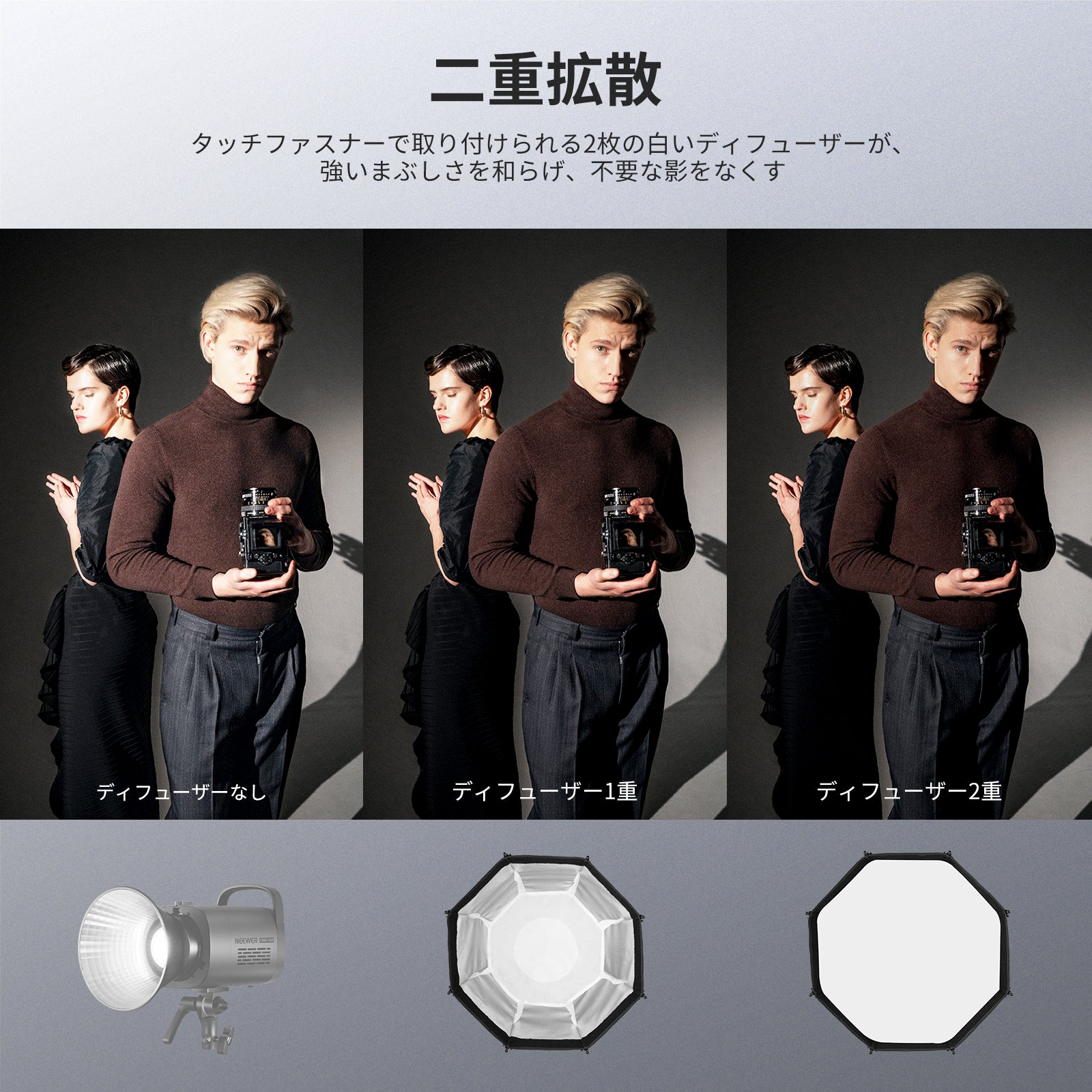 【ハニカムグリッドとディフューザー】内部ディフューザーと外部ディフューザーを組み合わせることで、よりソフトで拡散された光を得ることができます。ハニカムグリッドは光を45°に導き、光のこぼれを抑え、モデルの顔の骨格を際立たせる、ソフトでありながらパンチのある独特の照明効果を提供します。