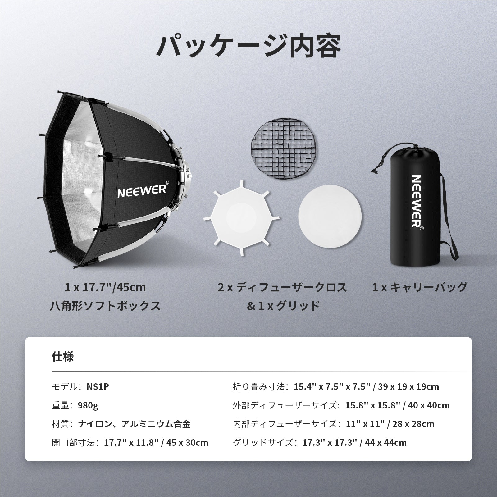 【プロ八角形ソフトボックス】この八角形ソフトボックスの開口サイズは17.7" x 11.8"/45 x 30cmで、厚手のナイロン生地に滑らかで均一なシルバーの内部コーティングが施されており、本来の色調を保ちながら光を広げ、拡散し、柔らかくし、2層のディフューザーとハニカムグリッドにより、アウトプットに最適です。