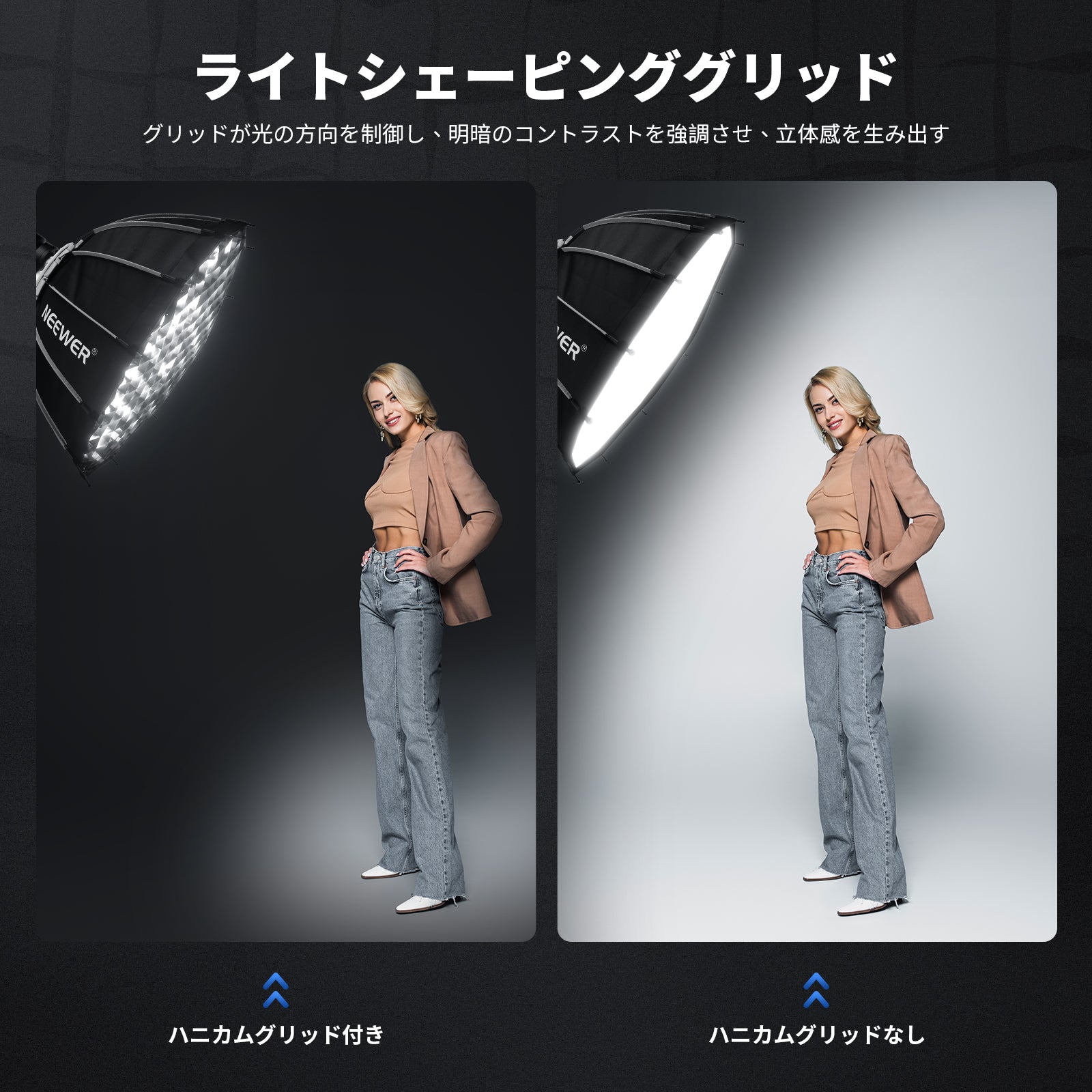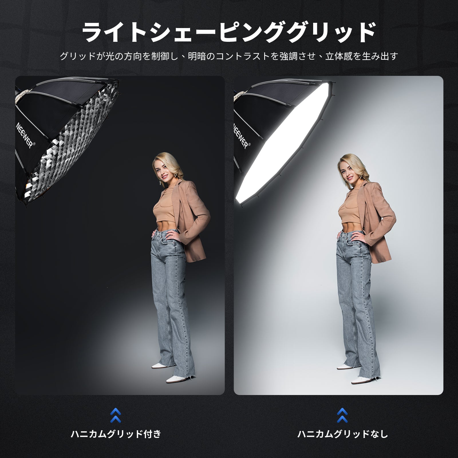 • 【ハニカムグリッド&ディフューザー】内側と外側のディフューザーを組み合わせることで、より柔らかく拡散した光を得ることができ、面ファスナーで簡単に取り付けられます。ハニカムグリッドは光を45°の角度で導き、不要な光の散乱を抑えて、被写体の顔の輪郭を際立たせる柔らかく表情豊かな光を作り出します。