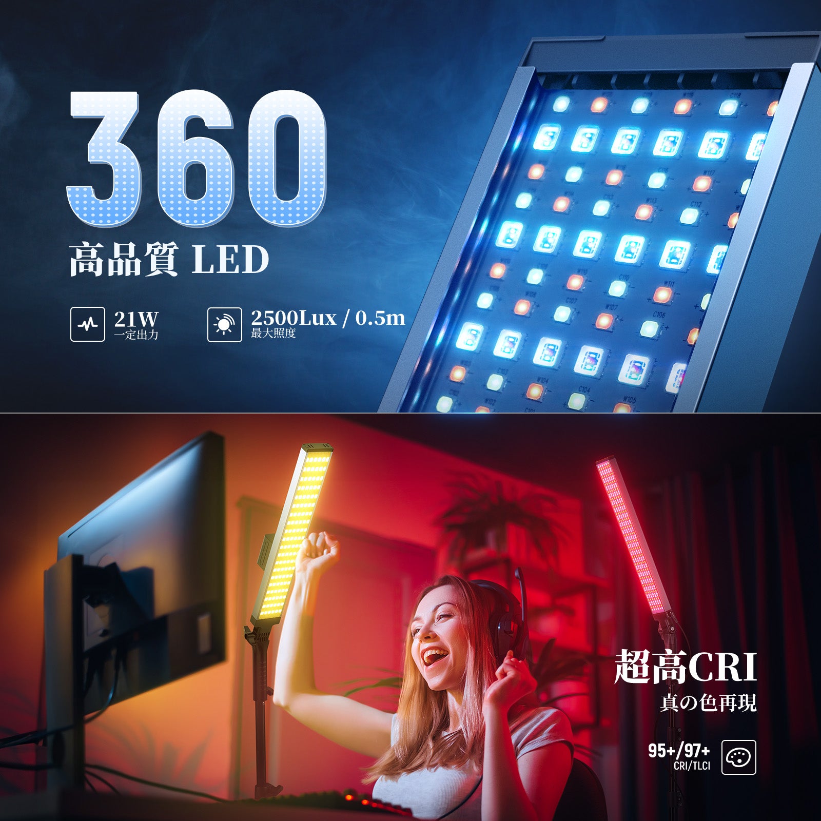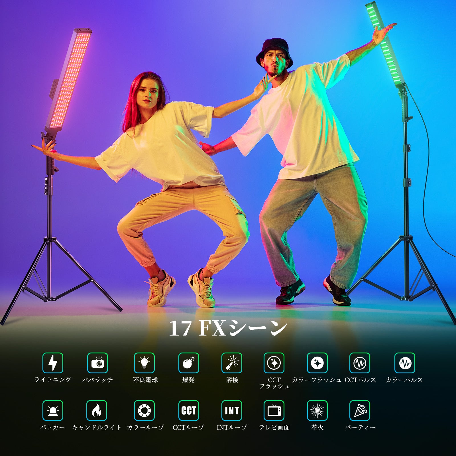 - 【プロスタジオ照明キット】RGBチューブライト×2、ライトスタンド×2、ディフューザー×2、電源コード×2、電源アダプター×2が含まれています。21Wスティックライトには360個のプレミアムLEDが内蔵されており、0.5m(5600K)で最大照度3250luxを実現します。2500K~10000Kの幅広い色温度範囲と0~100%の明るさ調節が可能で、どんな環境にも最適な雰囲気を作り出します。白いディフューザーが光を和らげ、影を減らして撮影結果を向上させます。