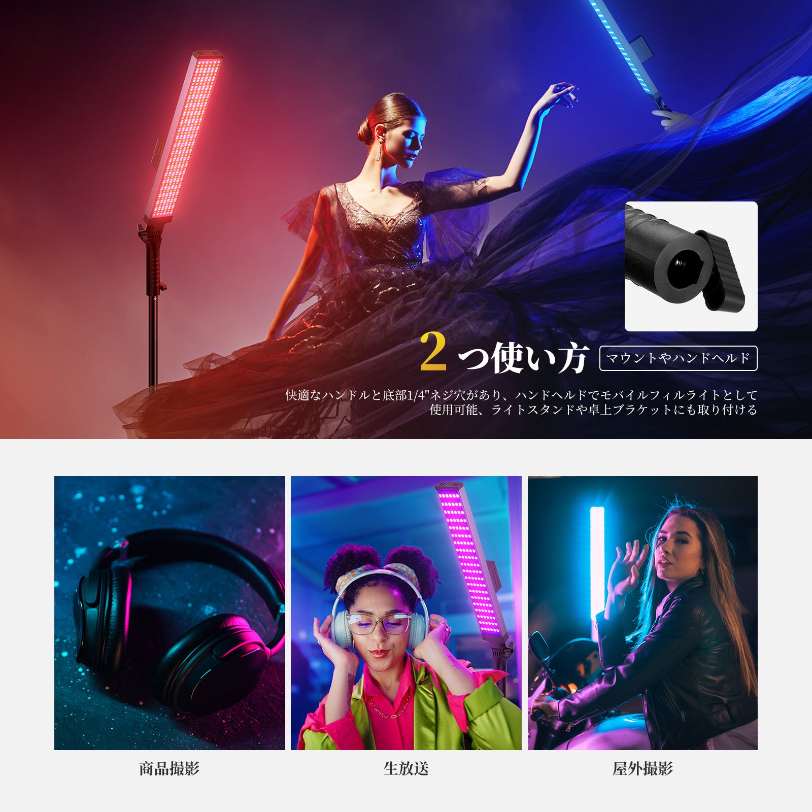 - 【ライトスタンド取り付け&手持ち使用】LEDビデオスティックライトは、長さ5.1″/13cm、180°傾け、滑りにくく、手軽く、便利な照明として使用できます。コンパチブル iPhone、Androidスマホで自撮りやカメラ撮影に対応しています。さらに、各ライトワンドには、32.5-76.6″/82.5-194.5cmの高さに調節可能なライト三脚スタンドが付属しています。これらの照明アクセサリーは底部の1/4"ネジで、ライトスタンド、卓上スタンド、ブームアームに素早く取り付けることができます。