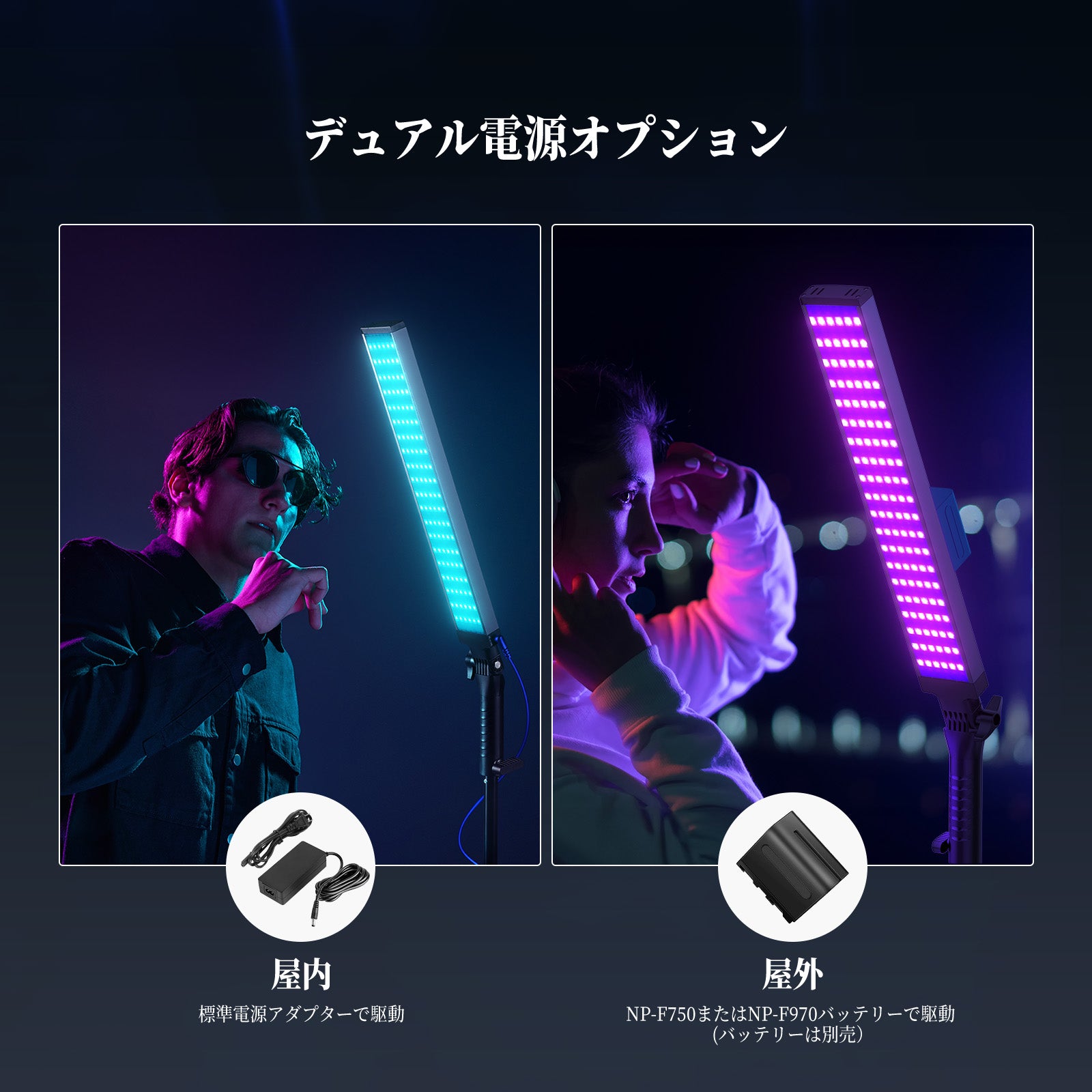 - 【アダプター/NP-Fバッテリーによるデュアル電源オプション】付属の電源アダプターとケーブルは、電源ソケットに接続することで、長時間の屋内撮影に信頼性の高いソリューションを提供します。屋外撮影では、NP-F750またはNP-F970バッテリー(別売)を使用して、これらのLEDチューブライトに電力を供給でき、柔軟性が高まり、ケーブルの煩わしさがなくなります