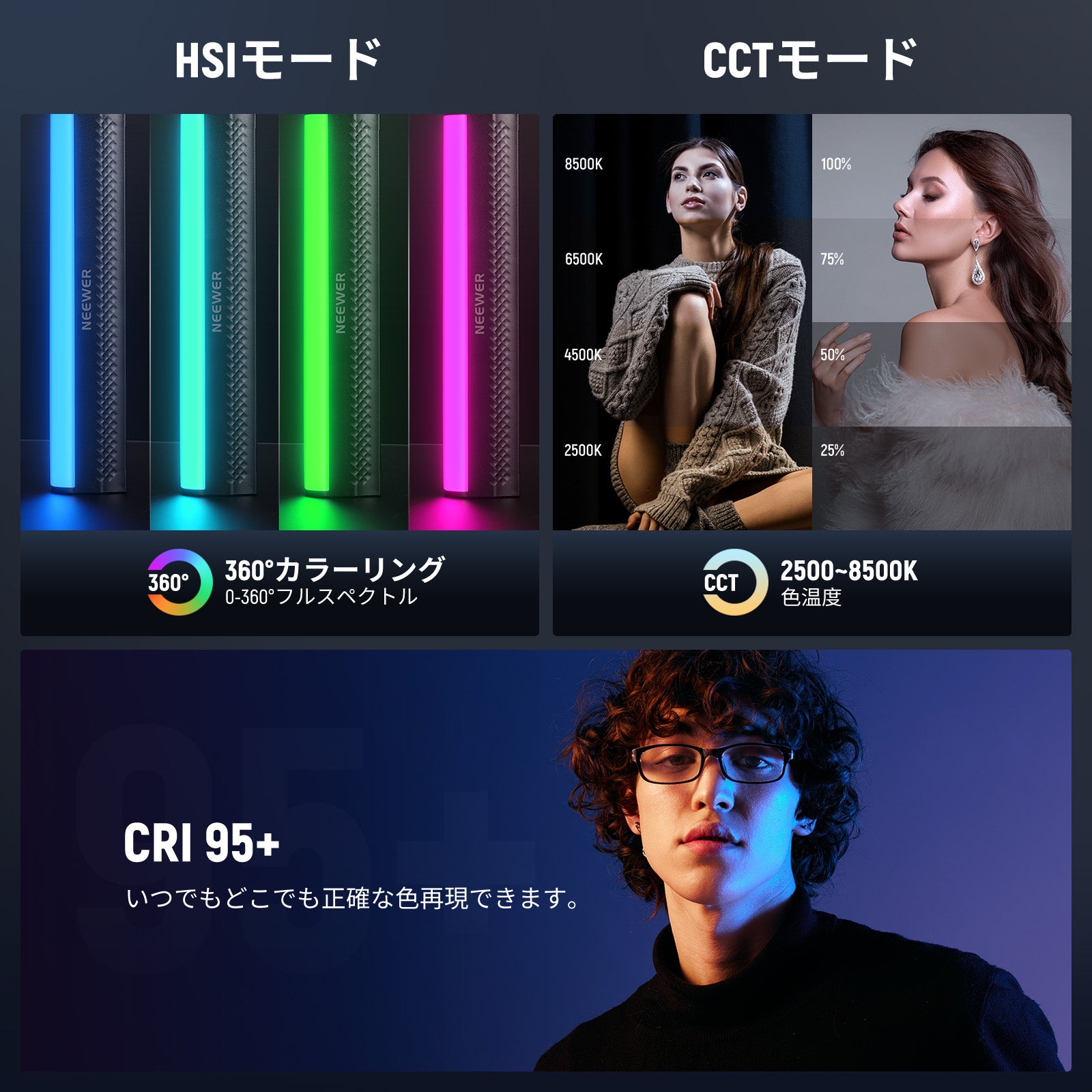 - 【多用途手持ちRGBカラフルスティックライト】NEEWER 10W RGBライトは195個の強力なLEDを搭載し、0.5mで最大照度730luxを実現し、95+CRIでちらつきやまぶしさなしに、より正確な演色性を実現します。サイズは9"x 1.6"x 1.8"/ 228 x 40 x 45mm、重さはわずか270gで、片手でグリップすることができ、カメラギア写真撮影、撮影、生放送、パーティー、結婚式、キャンプ、静物写真、スタジオ写真撮影、YouTube / TikTokビデオ録画などに最適な照明アクセサリーです。