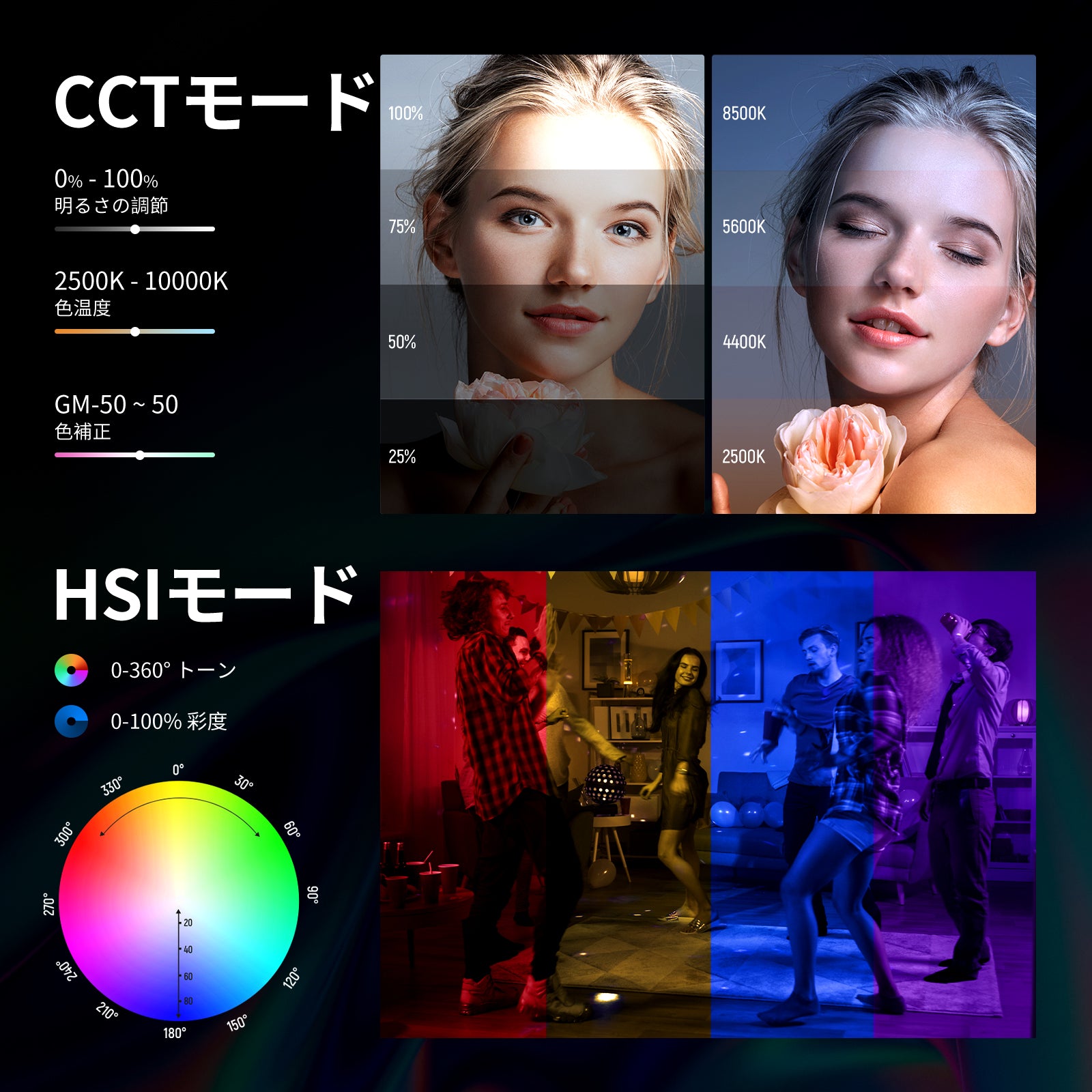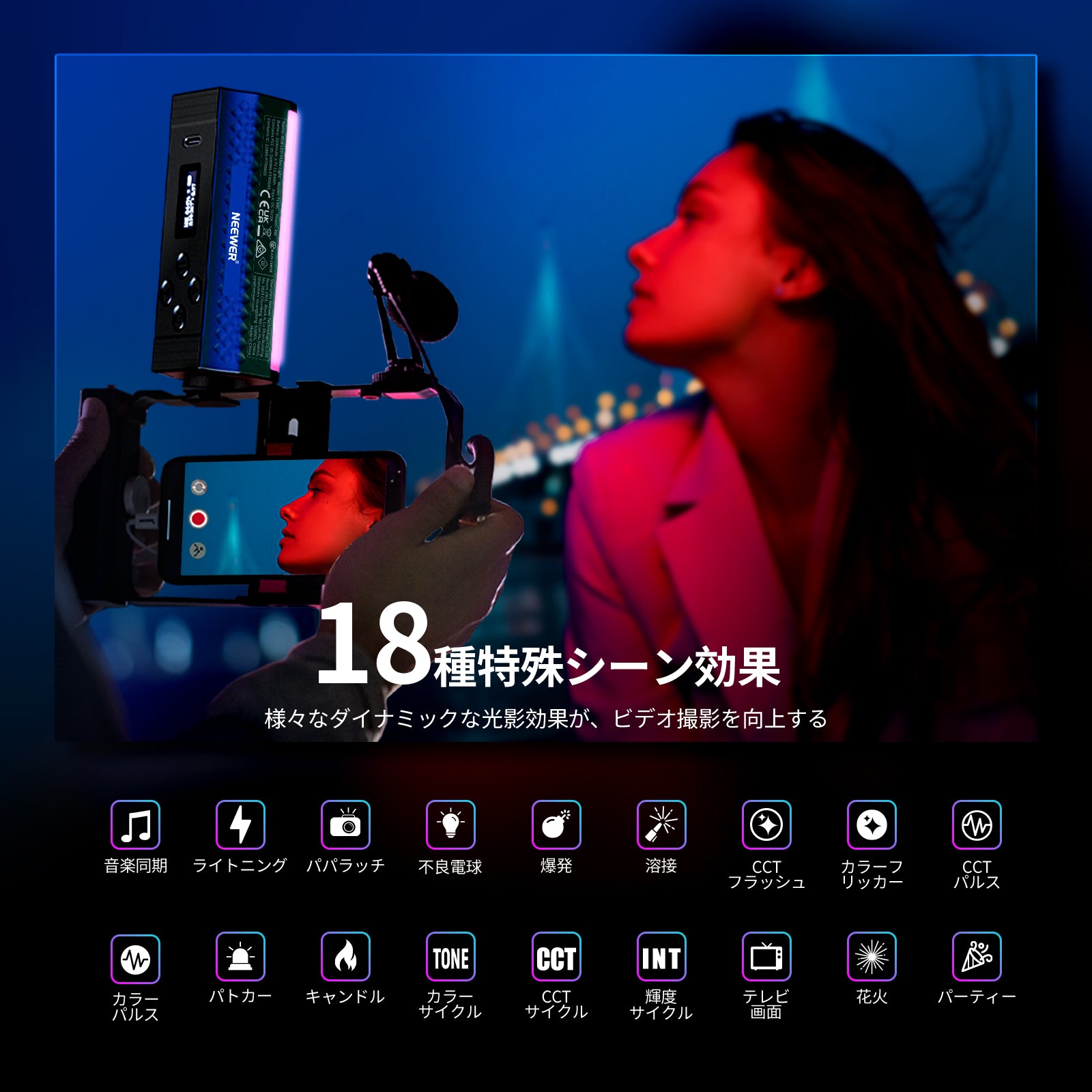 - 【CCT/HSI/FXモードによる創造性的な照明】LEDチューブスティックライトは、カスタム照明シーンに合わせて正確な光調整が可能です。CCTモードで2500Kから10000Kの色温度を調整し、内蔵のGM調整で色調整を行います。HSIモードは360°トーン、0~100%明るさ、0~100%彩度を微調整します。パトカー、ライトニング、花火など17種シーン効果があります。OLEDディスプレイ物理ボタンで直感的に操作できます。アプリ経由でOTAファームウェアアップグレードに対応します。