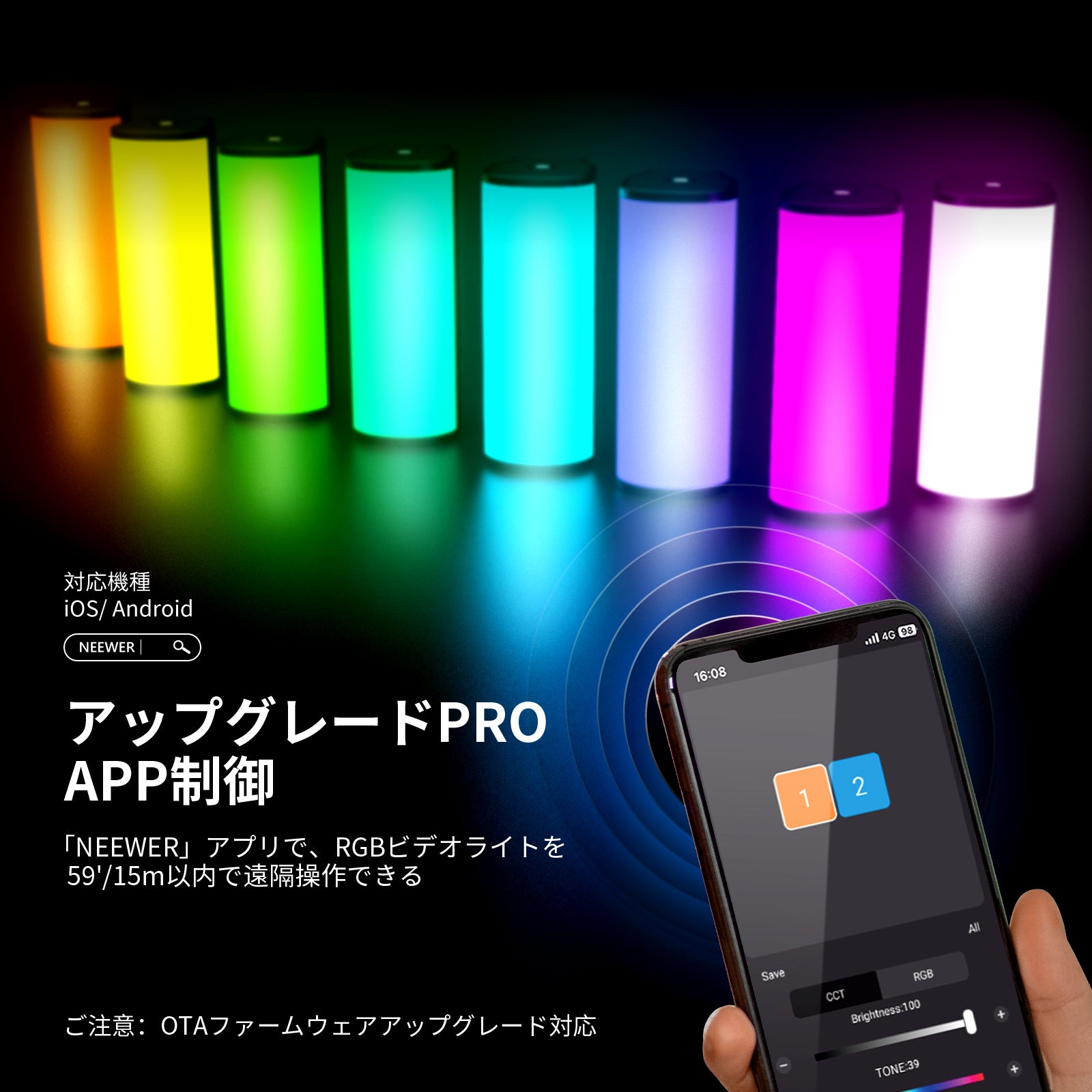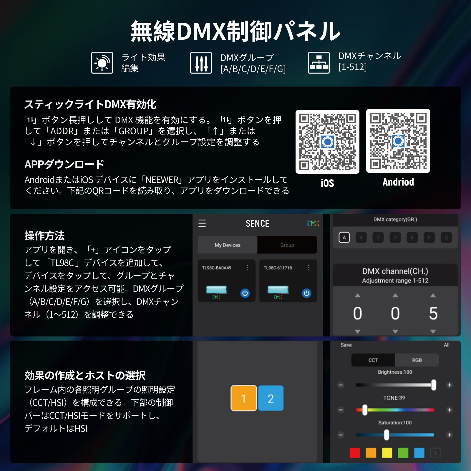 - 【アップグレードプロAPP制御】「NEEWER」アプリは59'/15m以内でRGBビデオライトを遠隔操作できます。アップグレードされたアプリは、明るさ、色温度、彩度、シーンを調整可能だけでなく、複数のプリセットを保存でき、DMX接続を介してより多くのプロライト設定をサポートしています。例えば、照明効果のカスタムプログラミングやストレージ、複数ライトグループ制御、8つのグループを提供でき、それぞれ最大128個のライトをサポートでき、より効率的なライト管理が可能です。