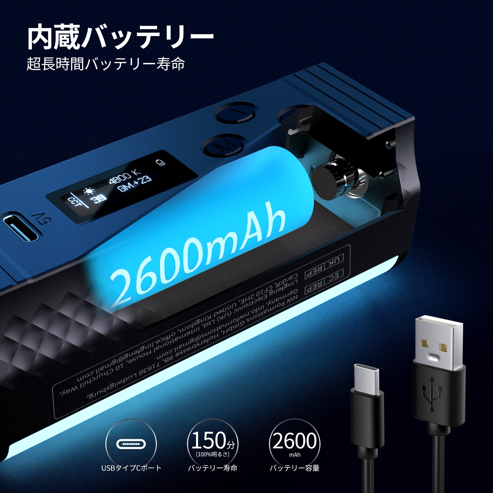 - 【2600mAh充電式リチウムバッテリー】3.7V 2600mAhのリチウムバッテリーは、100%の明るさで最大150分間の連続点灯が可能です。5V 2AのType-Cポート経由で約130分でフル充電が完了し、使用中の充電にも対応しているため、一日中電源を切らすことなく使用できます。