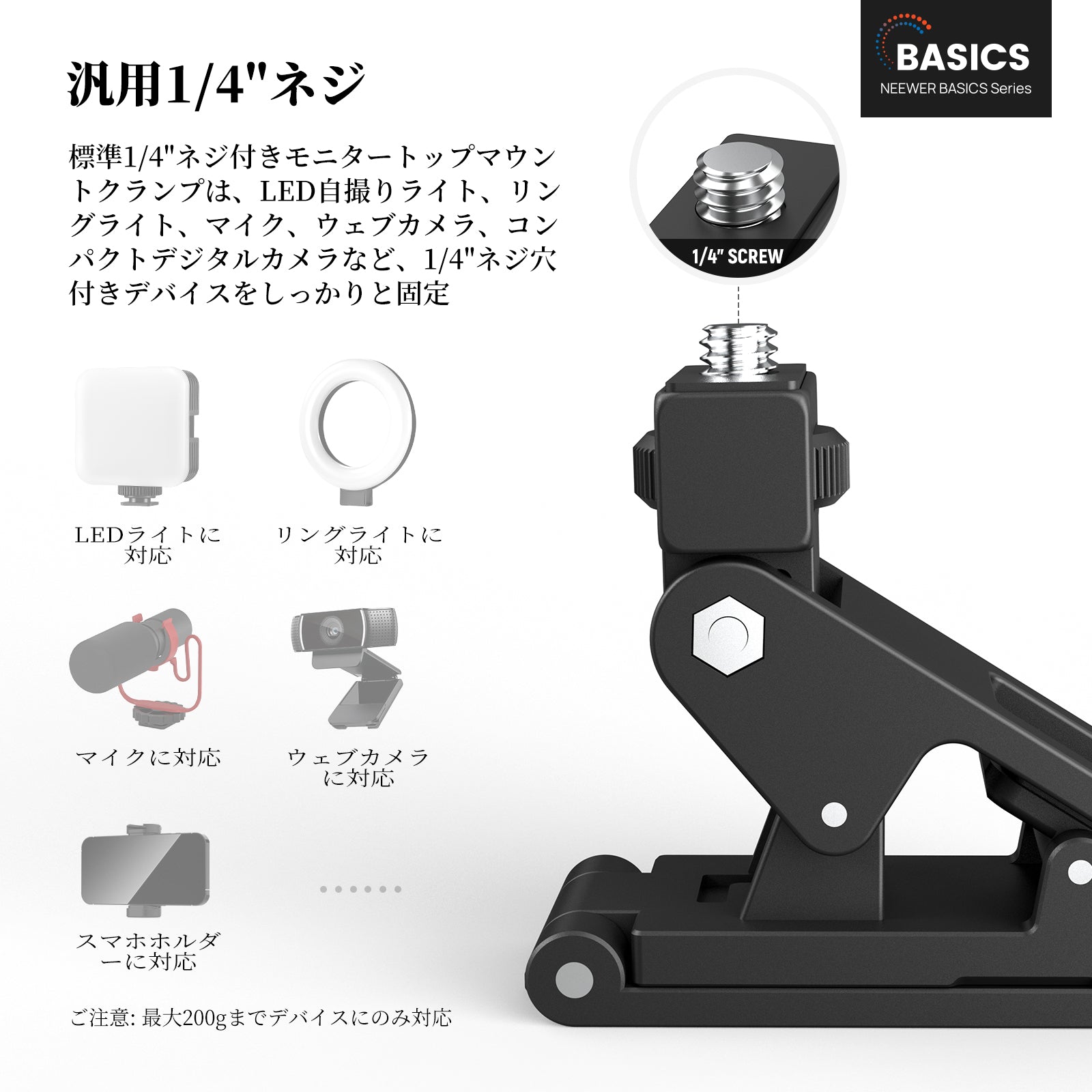 • 【汎用1/4"ネジ】モニタートップマウントクランプは標準の1/4"ネジを備え、LED自撮りライト、リングライト、マイク、ウェブカメラ、コンパクトデジタルカメラ、その他1/4"ネジ穴を備えたデバイスをしっかりと固定できます。ご注意:最大200gまでのデバイスのみにサポートします。