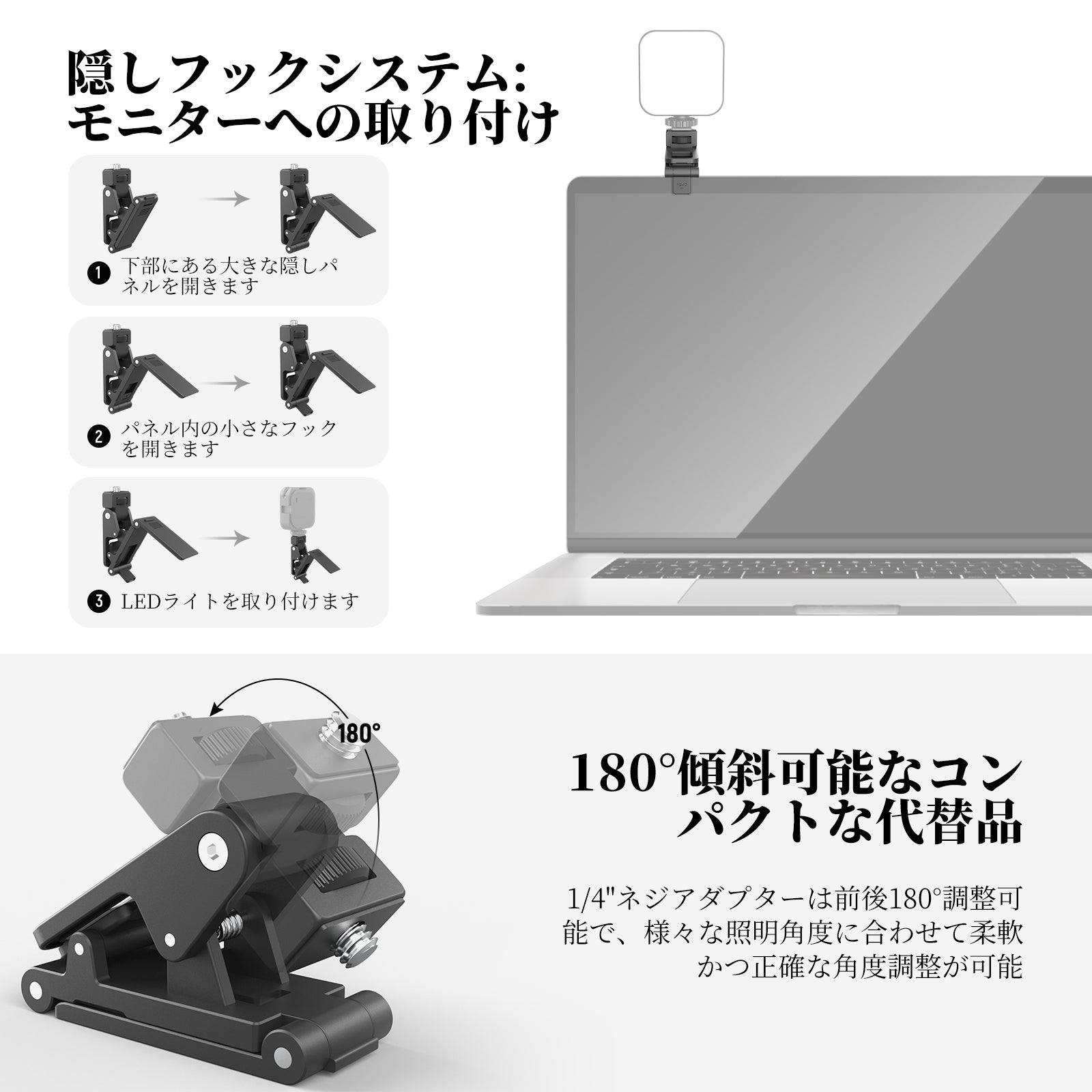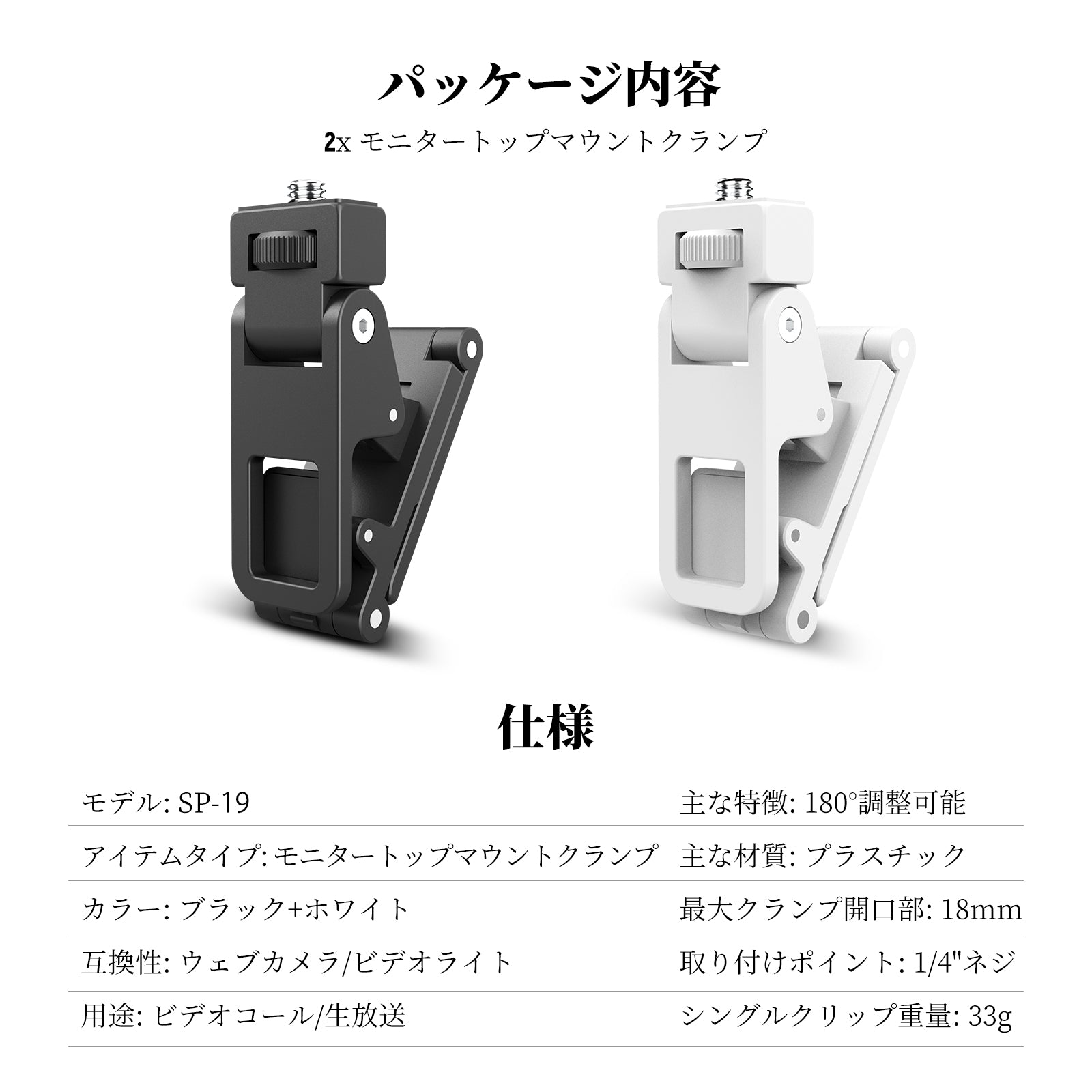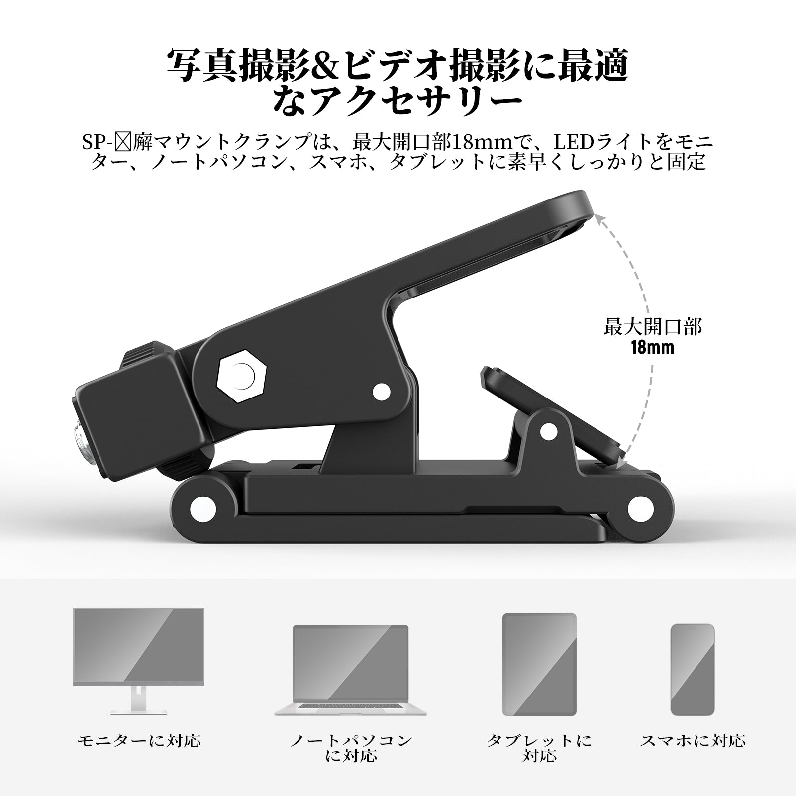 • 【写真撮影とビデオ撮影に最適なアクセサリー】最大開口部18mmのSP-19マウントクランプは、モニター、コンピューターカメラ、ディスプレイ、ノートパソコン、スマホ(TikTok、YouTube動画撮影、ビデオ会議、ズーム通話、生放送、セルフィー、vlogなどの場合)、タブレットなどのデバイスにLED ライトを素早く安全に取り付けられます。プロな写真家&ビデオグラファー、ストリーマー、ソーシャルメディアインフルエンサー、コンテンツクリエイターにとって必要なアクセサリー&照明設備です。