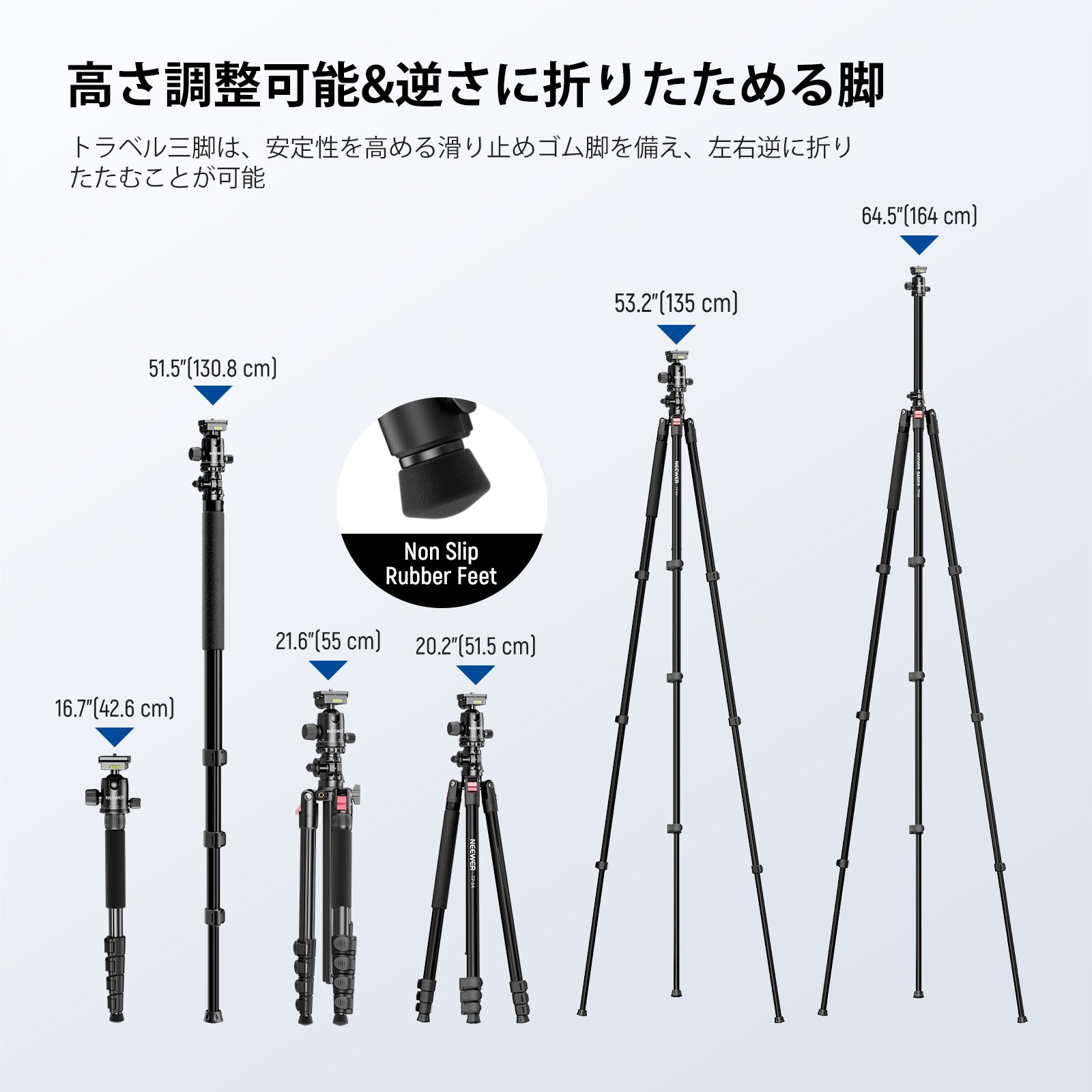 - 【高さ調整】頑丈なトラベル三脚は、5段折りたたみ式脚を備え、最長164cmまで伸縮し、スマホとカメラを取り付けます。フリップロックで簡単に高さ調整可能で、しっかりと固定します。高さと角度を柔軟に設定でき、多様な俯瞰撮影構図が可能で、創造な撮影できます。片方の脚を簡単に取り外せば、写真や動画撮影用一脚としても使用できます。