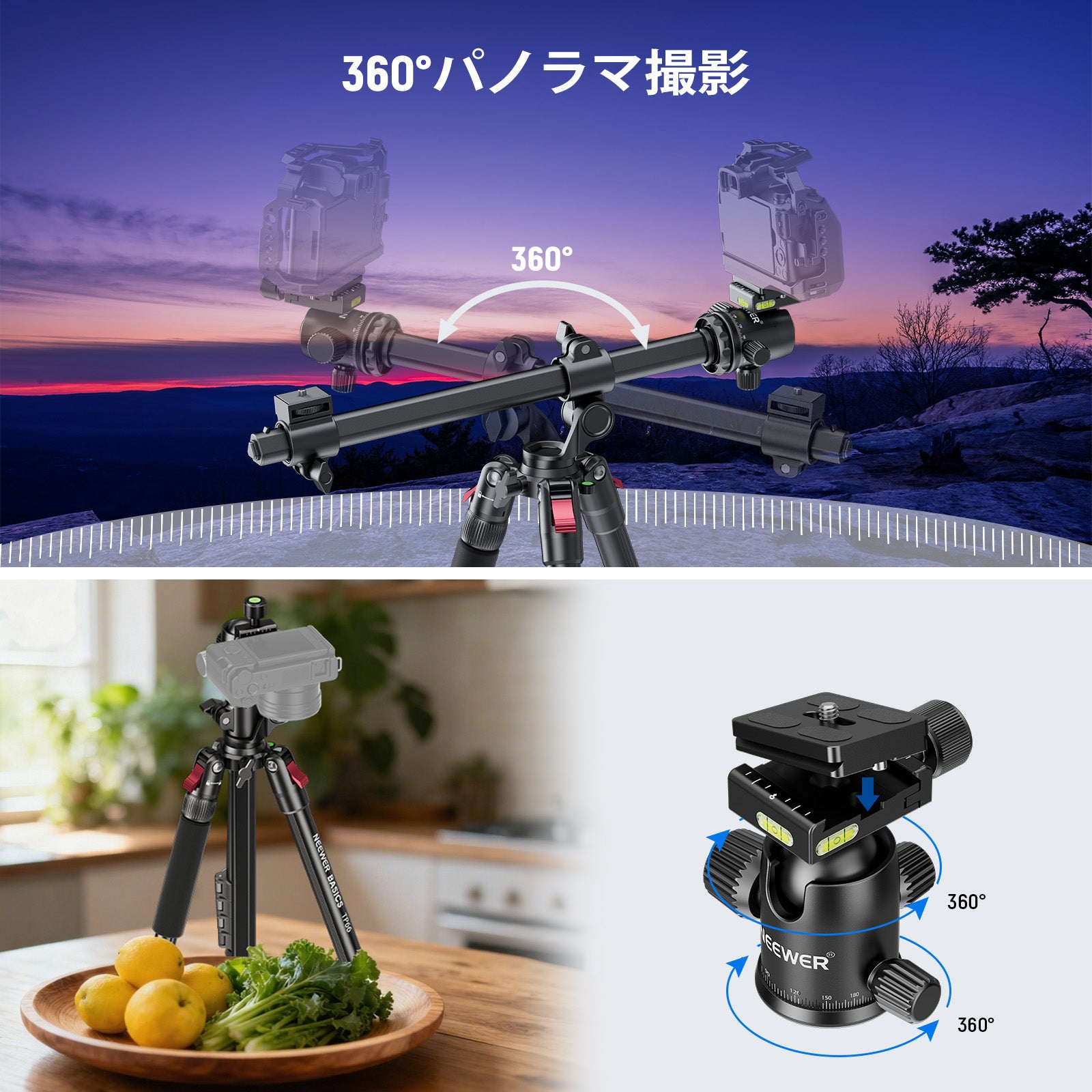 - 【多角度調整&クイックリリース】センターポールはロックノブで180°チルト、360°回転で、水平、垂直、斜め位置を素早く切り替えられ、様々な撮影ニーズに対応し、プロ仕様カメラ三脚は、反転させることもでき、ローアングルやマクロ撮影できます。360°ボールヘッドは、アルカ規格クイックリリースプレートが付属し、素早い着脱を可能にします。