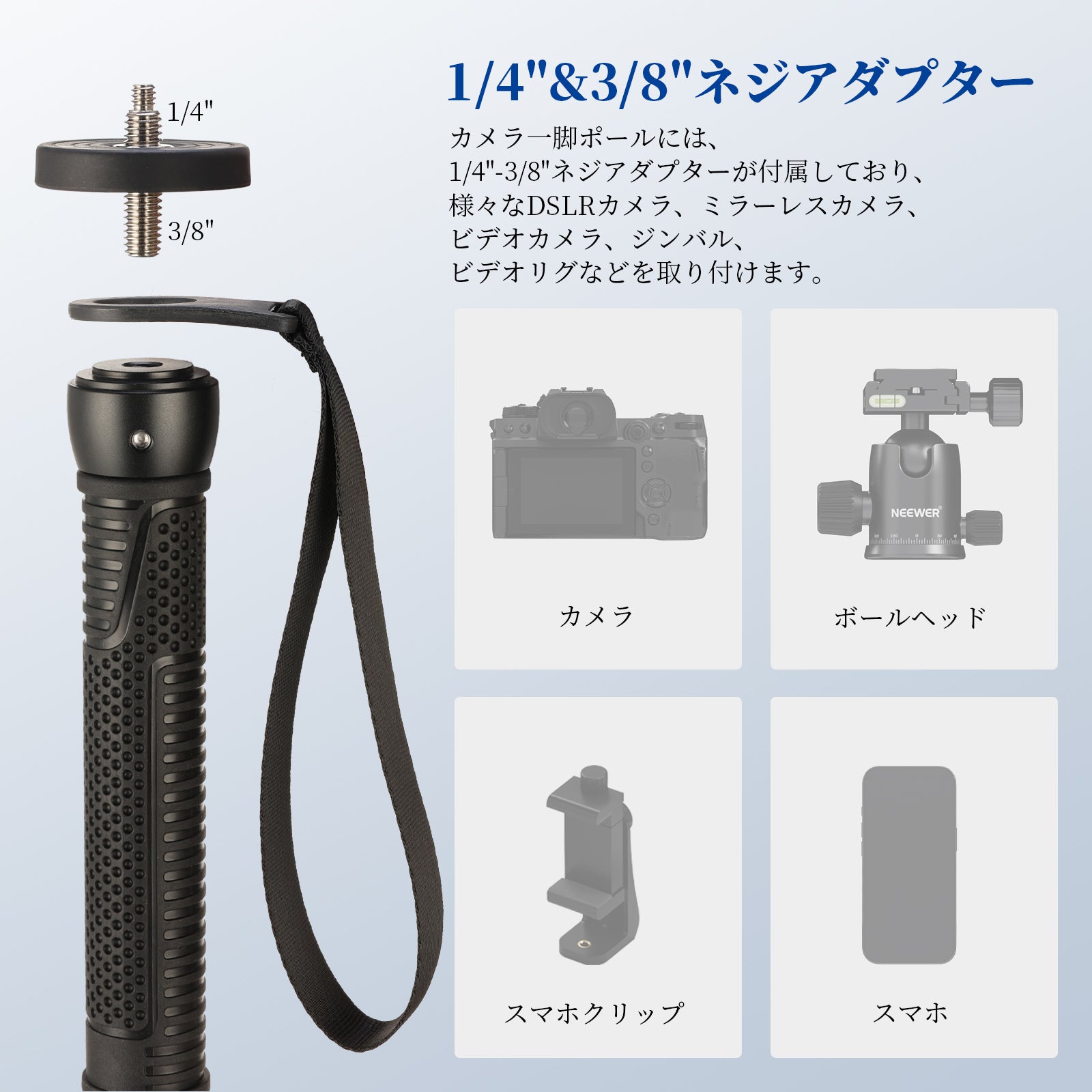 - 【1/4"&3/8"ネジアダプター】カメラ一脚のポールには、1/4"から3/8"へのネジアダプターが装備されています。様々なDSLRカメラ、ミラーレスカメラ、ビデオカメラ、ジンバル、ビデオリグなどを取り付け、コンパチブル Insta360、コンパチブル DJIアクションカメラ、コンパチブル GoProマウントアダプター、コンパチブル iPhone Androidスマホホルダー、その他の写真撮影およびビデオ撮影機器、ギア、アクセサリー。