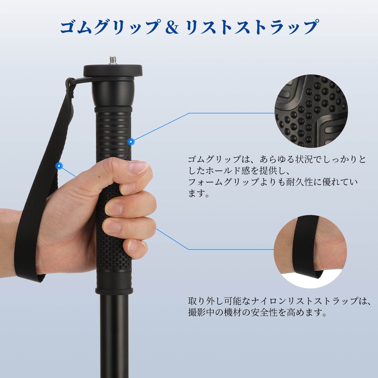 【ゴムグリップ&リストストラップ】ゴムグリップ滑り止め設計で、どのような状況でもしっかりと保持し、経年劣化するフォームグリップよりも長持ちします。さらに、一脚には着脱式ナイロンリストストラップが付属しており、撮影中に機材を安全に保管できます。