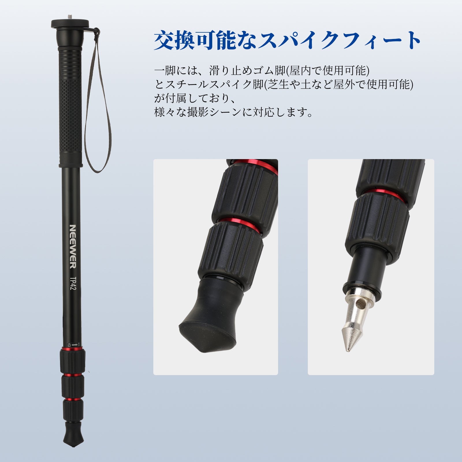 - 【交換可能なスパイクフィート】一脚には滑り止めゴム足が付いており、床や岩のような屋内の滑らかな表面で安定してグリップします。一方、交換可能なスチールスパイクフィートは、芝生、砂、土などの柔らかい屋外表面用に設計されています。カメラスタンドの交換可能な設計は、さまざまな撮影シナリオに柔軟かつ多用途に対応します。
