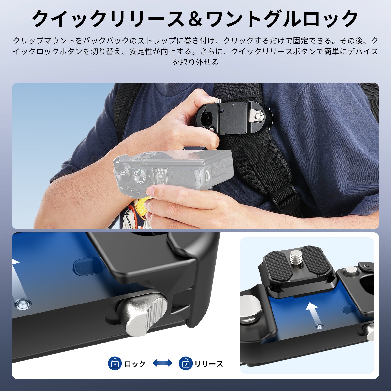 - 【安全な取り付けとクイックリリース】クリックするだけで、クリップマウントはバックパックストラップに簡単に取り付けられ、アップグレードされた安全ラッチにより、安全性を高め、偶発的な脱落を防ぎます。さらに、クイックリリースボタンで簡単にデバイスを取り外すことができます。
