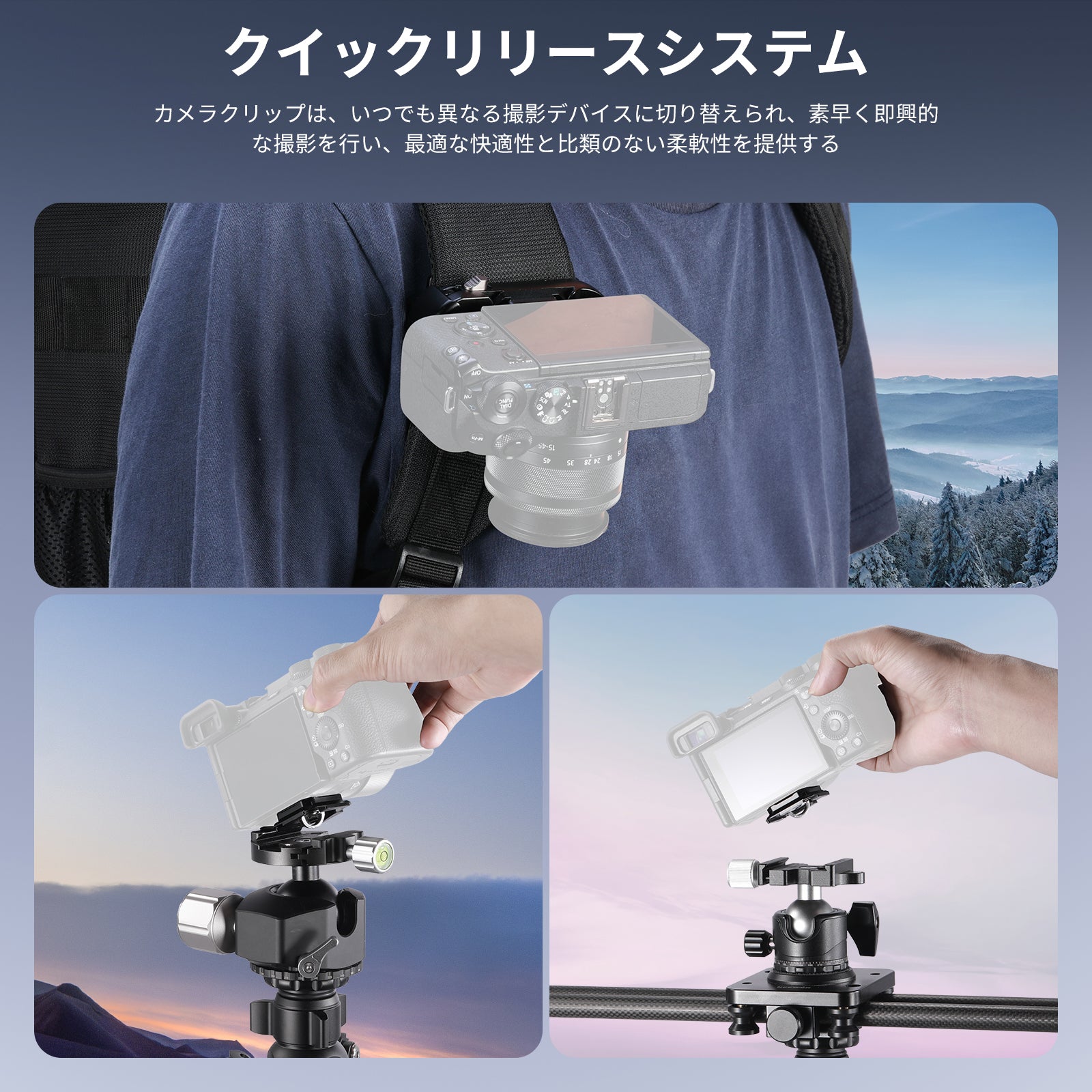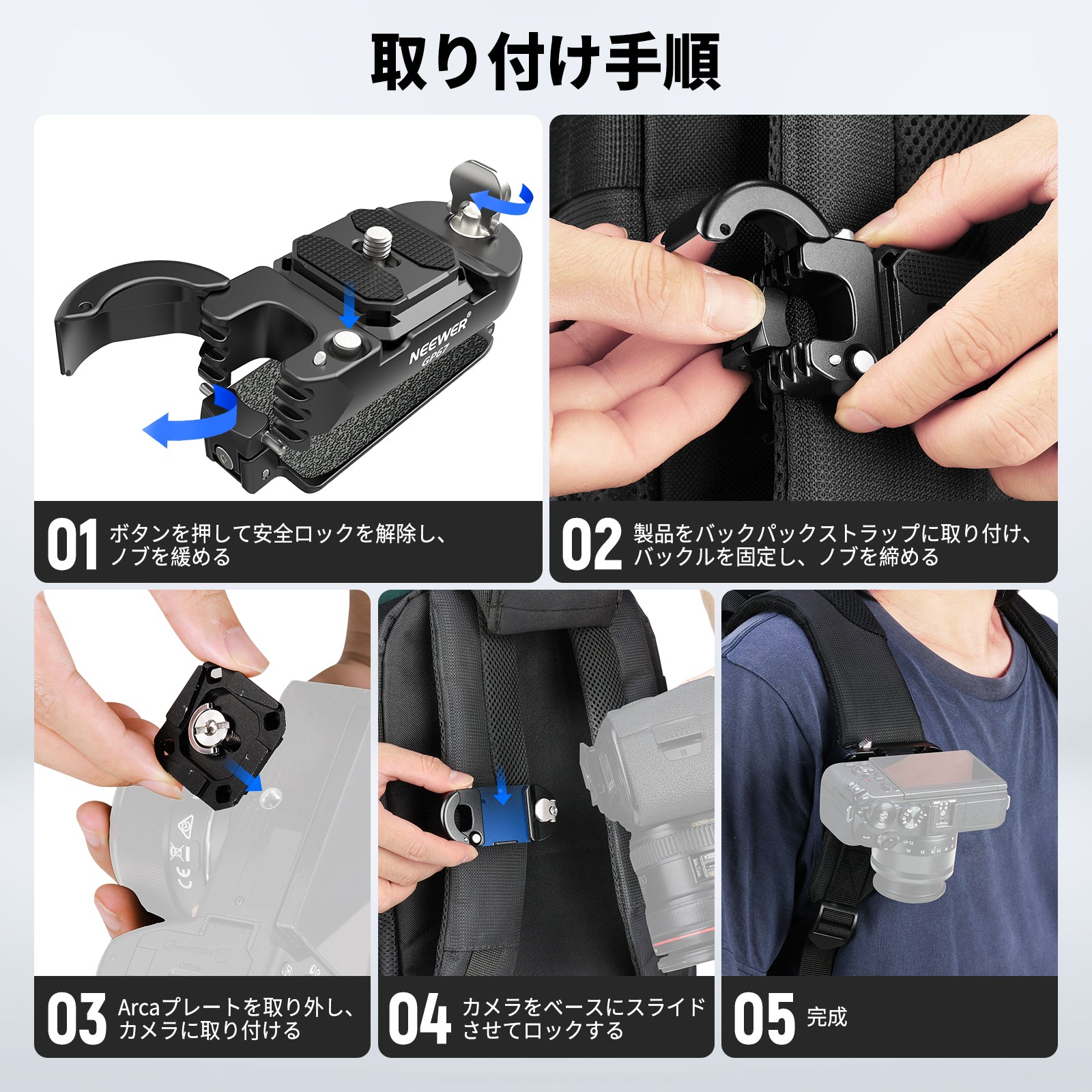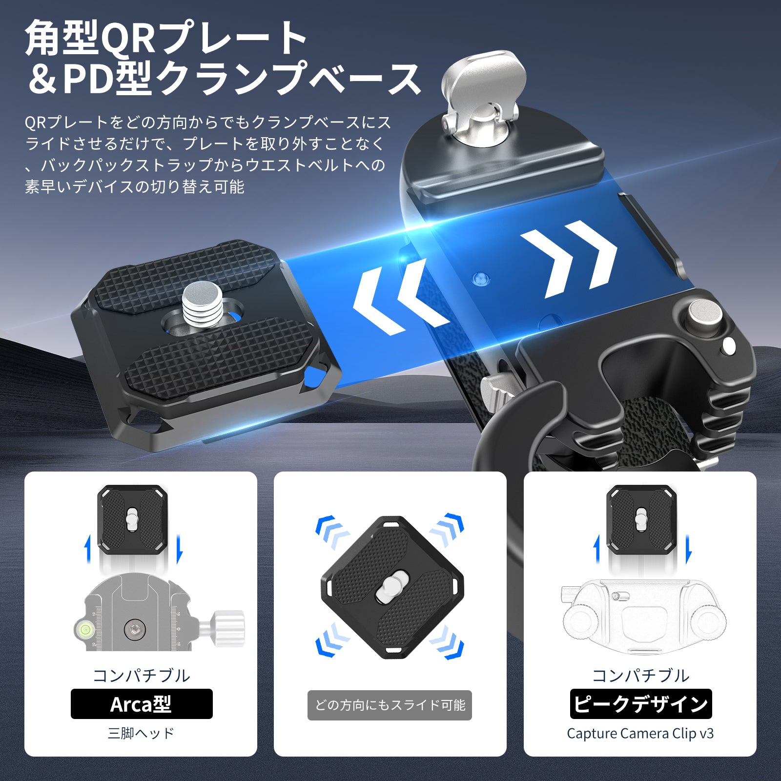 - 【角型QRプレート&PDタイプクランプベース】QRマウントクランプは、コンパチブル Peak Design QRプレートCapture Clipと付属のArca型プレート。QRプレートをどの方向からでもクランプベースにスライドさせるだけで、プレートを取り外すことなく、バックパックストラップからウエストベルトに素早くデバイスを切り替えることができます。