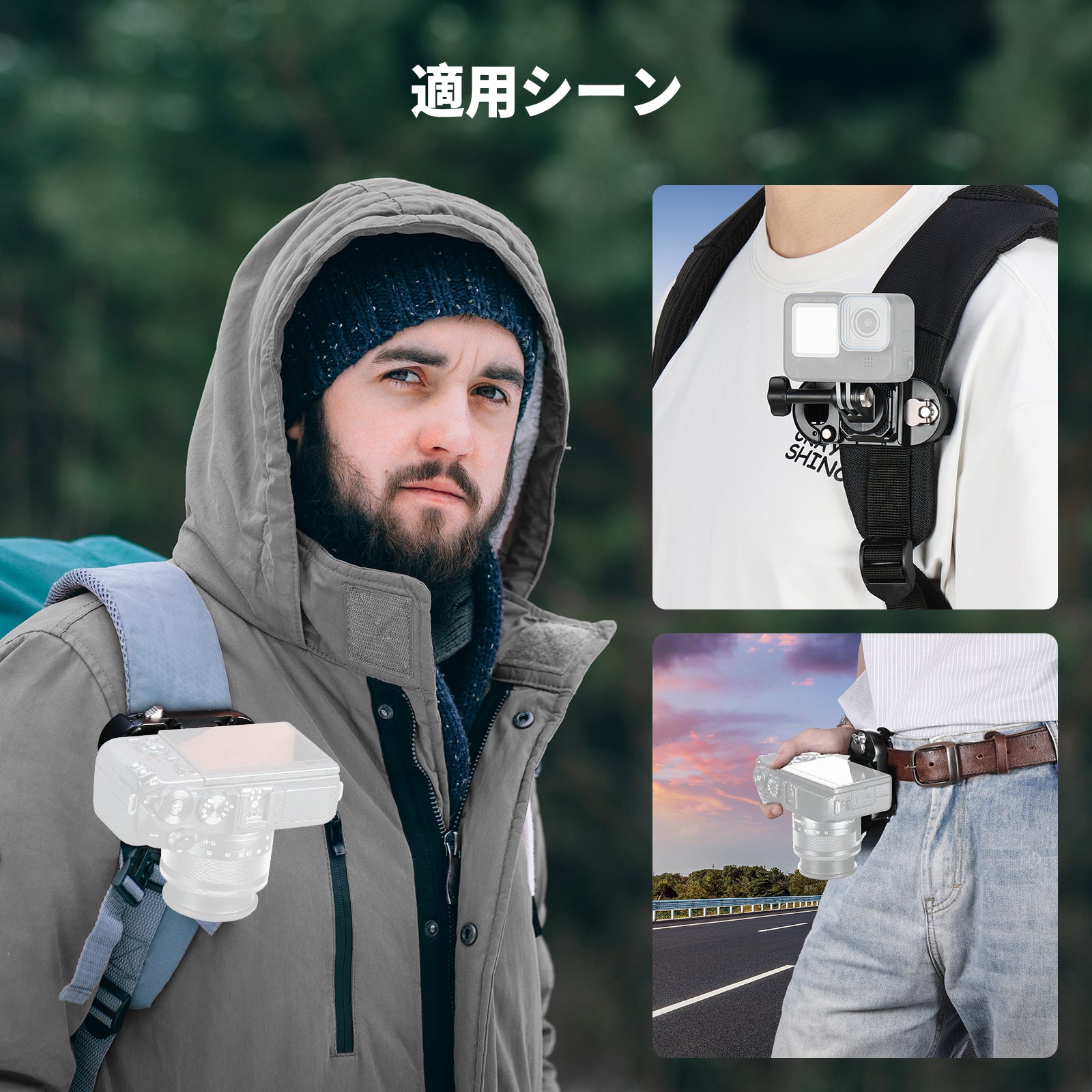 - 【多用途バックパックカメラクリップ】カメラをバックパックのストラップやベルトに取り付けて、臨場感あふれるPOA撮影をできます。最大10mmの厚さと65mmの幅に対応します。カメラクリップをバックパックのストラップに水平に取り付け、首への負担が軽減され、臨場感あふれる撮影をできます。ベルトに垂直に取り付けると移動中のアクセスが便利になります。手持ち使用して素早く自撮りできます。カメラクリップは最適な快適性と比類のない柔軟性を提供します。