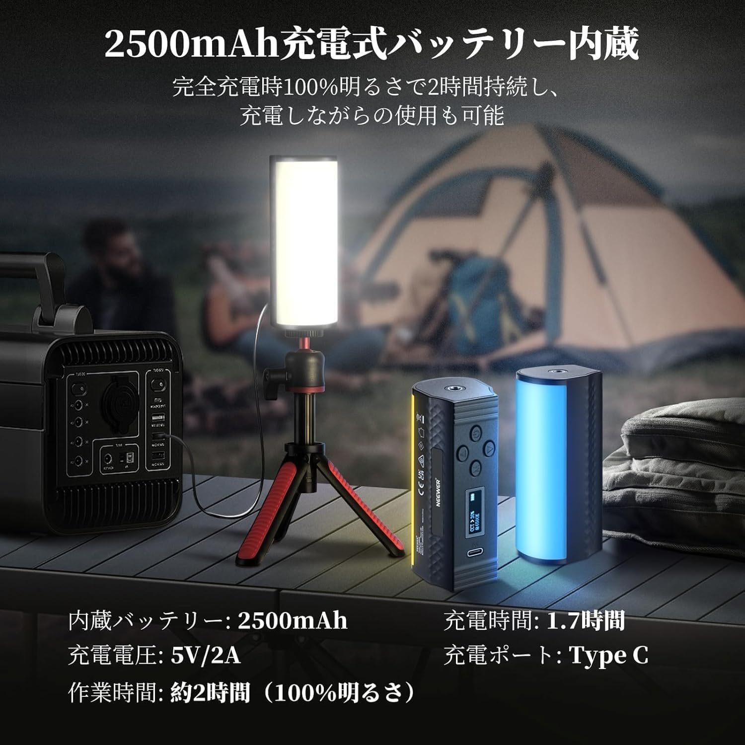 - 【内蔵充電式バッテリー】RGBライトには2500mAhの充電式リチウムバッテリーが内蔵されており、完全に充電すると最大2時間、100%の明るさでライトに電力を供給できます。 背面に USB Type-C 充電ポートがあり、付属の USB ケーブルと壁の充電器 (別売り) を介してライトを電源コンセントに接続すると、1.7 時間でバッテリーを完全に充電できます。 または、ポータブル充電器または 5V 2A USB ジャックで充電して、外出先で撮影することもできます。