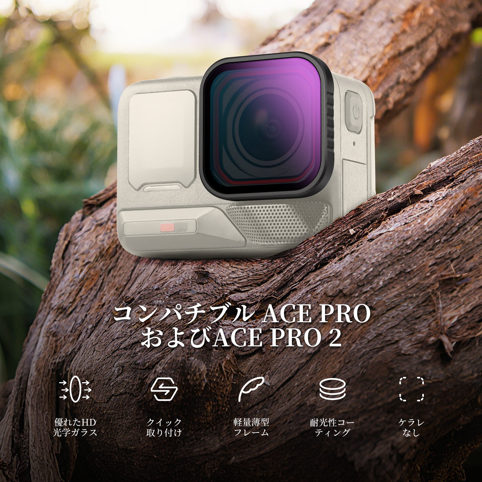 - 【Ace Pro/Ace Pro 2対応】4枚入りフィルターセットは、調整可能なCPL+UV+ブラック拡散1/4"+ND16が含まれ、Ace ProとAce Pro 2に対応しています。各フィルターはレンズに直接取り付けられ、ゴム製シールでしっかりと固定されます。多層コーティングにより、水、指紋、傷に強いです。ご注意: 1.水中で使用しないでください。水が浸入し、画質が低下する可能性があります。2.レンズガードが丸みを帯びた八角形デザインに変更された Ace Pro 2 の新バージョンには対応しておりません。