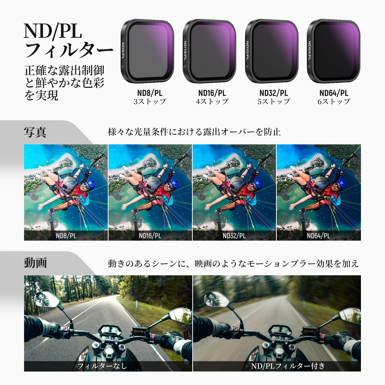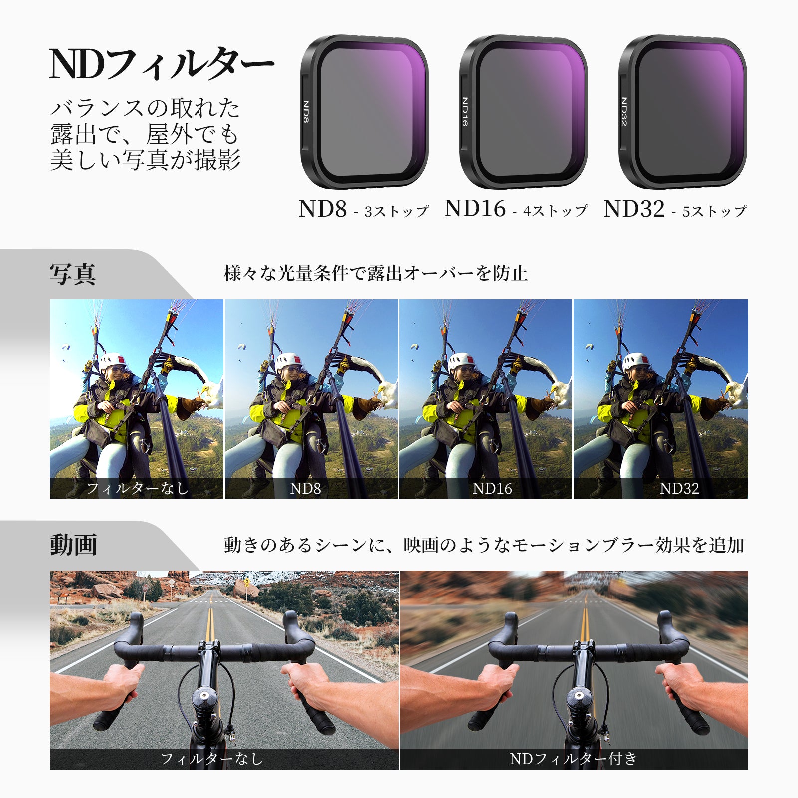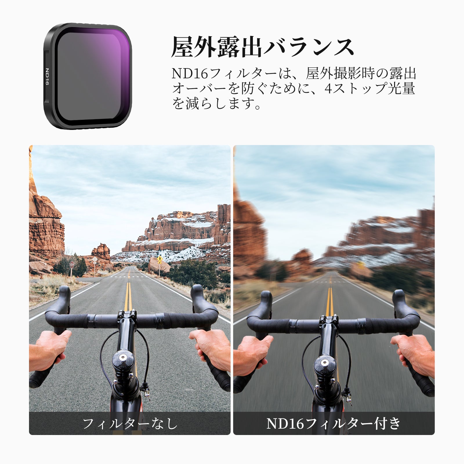 【屋外露出バランス】アクションカメラレンズ用ND16減光フィルターは、4ストップ光量を低減することで、屋外撮影時の露出オーバーを防ぎ、滝、川、光跡など動く被写体をモーションブラー効果で撮影できます。