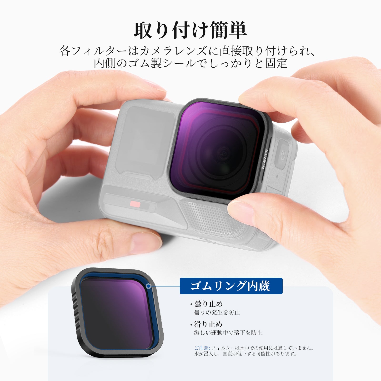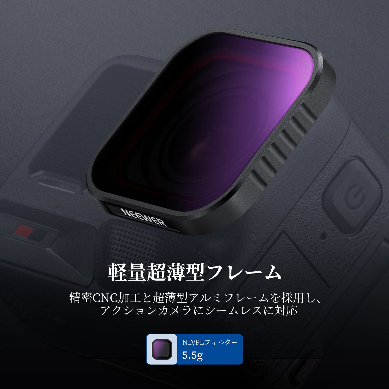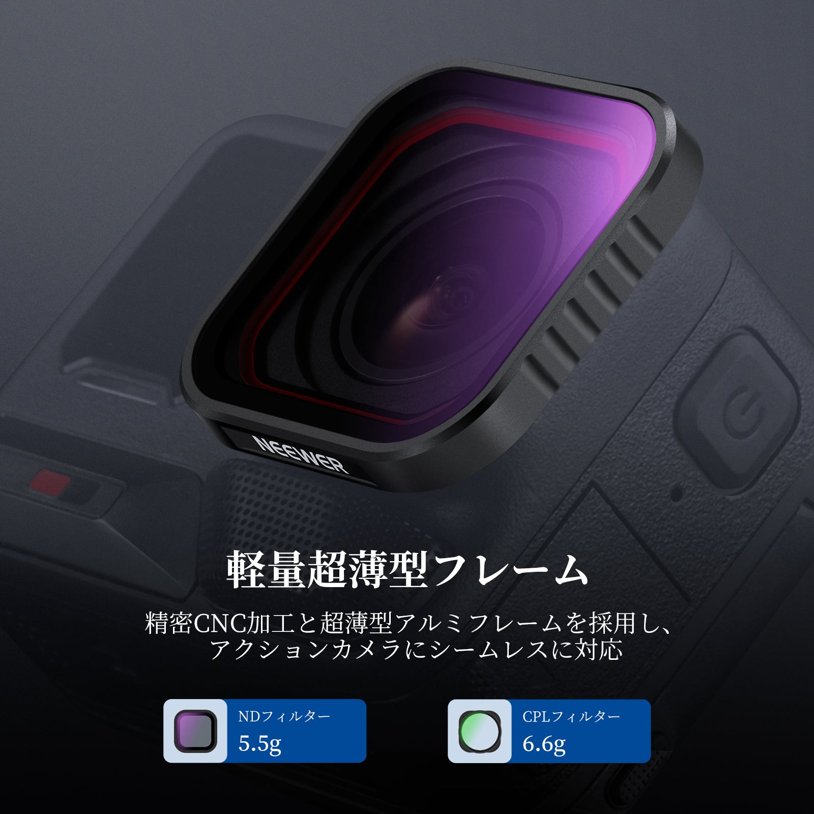 【屋外露出バランス】アクションカメラレンズ用ND16減光フィルターは、4ストップ光量を低減することで、屋外撮影時の露出オーバーを防ぎ、滝、川、光跡など動く被写体をモーションブラー効果で撮影できます。