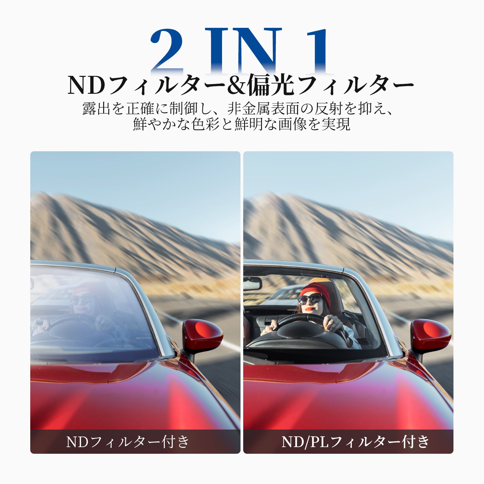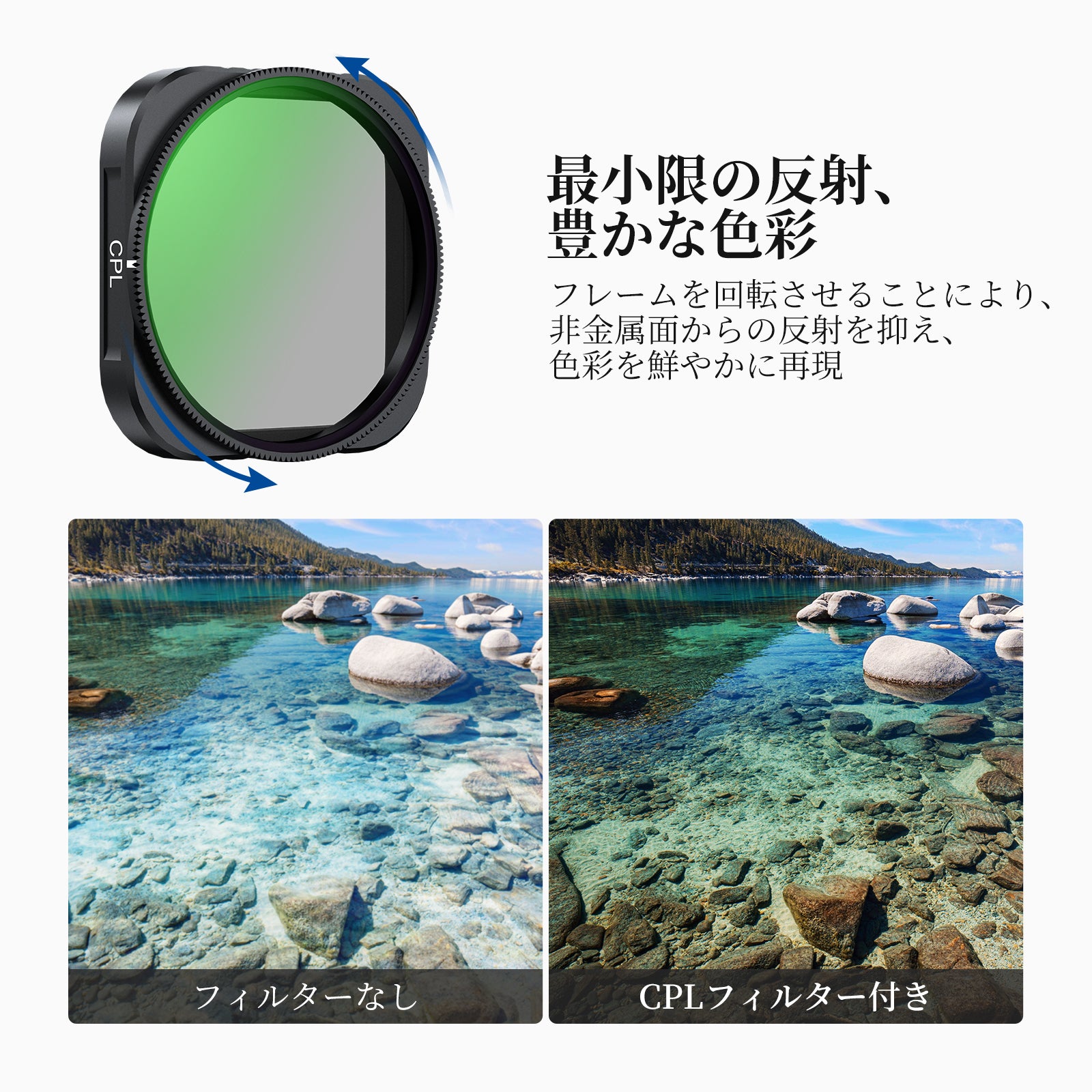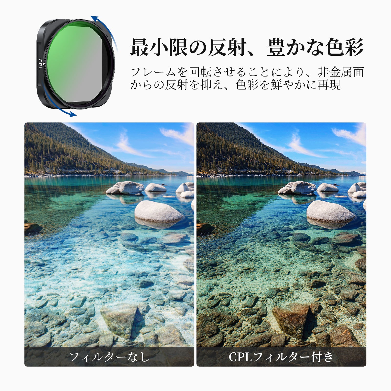 - 【反射を最小限に抑え、豊かな色彩】円偏光(ポラライザー)フィルターを回転させることで、水、ガラス、その他の非金属表面からの反射を除去し、コントラストと彩度を高め、より鮮やかな色彩表現を実現します。