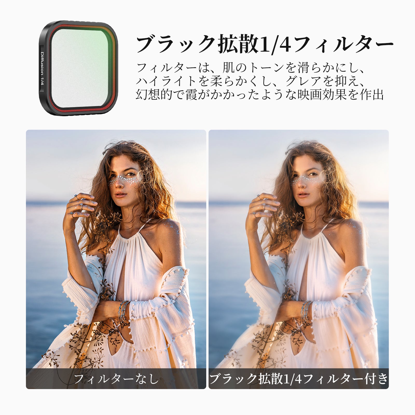 - 【夢のような映画効果】ブラック拡散1/4フィルターは、肌のトーンを滑らかにし、ハイライトを柔らかくし、グレアを抑え、ポートレート写真、動画撮影、Vlog撮影で、夢のような霞がかった映画効果を生み出します。コンテンツクリエイターにとって必要な写真アクセサリーであり、インフルエンサーにとって必要なアクションカメラギアです。