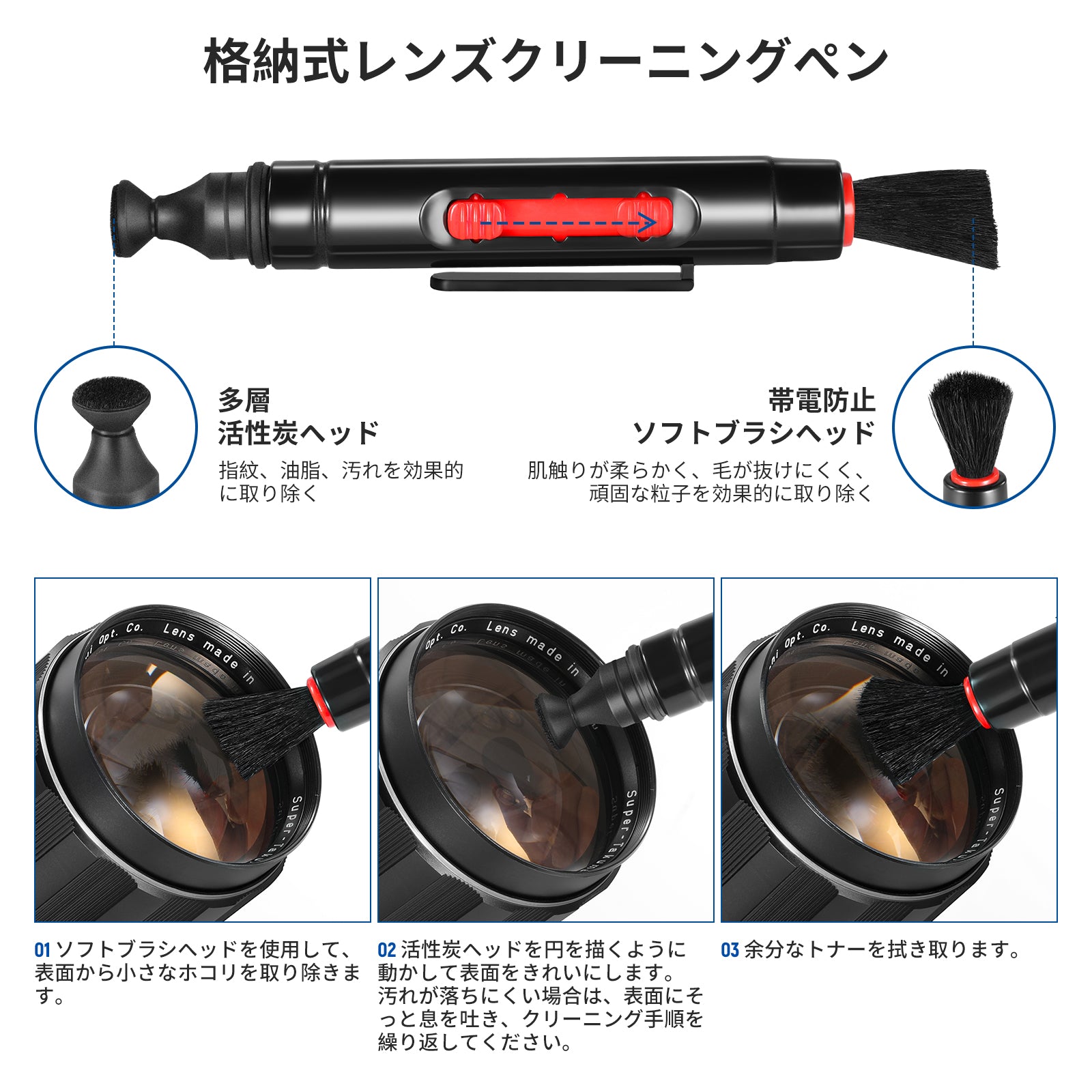 - 【フィルターとレンズのお手入れが簡単】ペン先が2本付いた格納式レンズクリーニングペンで、フィルターやレンズからほこり、破片、指紋、汚れを傷を付けることなく簡単に取り除くことができます。
