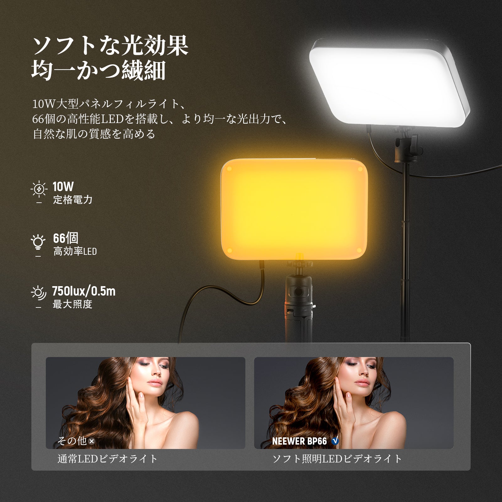 - 【バイカラー調色でプロ級光質】BP66 LEDパネルライトは、高品質の66個LEDを搭載、10W高輝度、0.5m距離での最大照度750ルクスを実現します。バイカラー調光(3200K/5600K)とCRI95+の高演色性で、肌の質感を自然に再現します。マグネット式カラーフィルター付きで暖色/寒色の均一な光を生成。メイク照明/自撮り補助光、TikTok/YouTube動画撮影、生配信/ポッドキャスト収録、Zoom会議/ビデオ通話、商品写真/スタジオ撮影など、マルチシーン対応します。