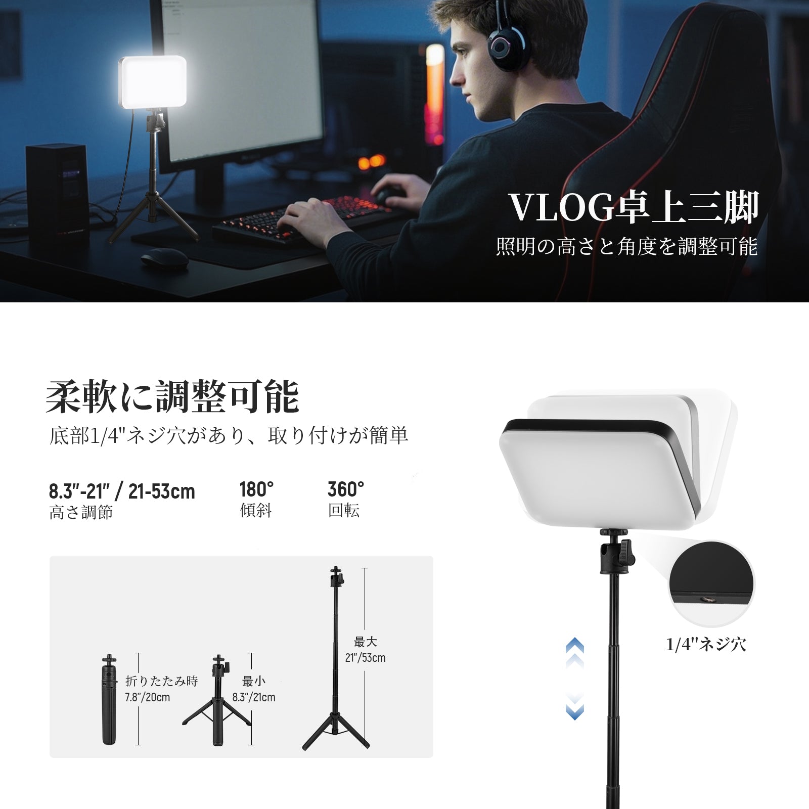 - 【高さ・角度調整可能なスタンド】高さ21-53cmの範囲で柔軟に調整可能なミニ卓上スタンドが付属。ノブ操作で簡単に設定・固定でき、照明範囲の調整も自在です。360°回転ボールヘッドにより、ライトパネルをスムーズに回転させ、多様な照明角度を実現可能。俯瞰撮影、ローアングル撮影、垂直撮影など様々なアングルに最適です。ゴム製の脚がテーブル上での安定性を確保し、あらゆる作業台でしっかりと固定されます。