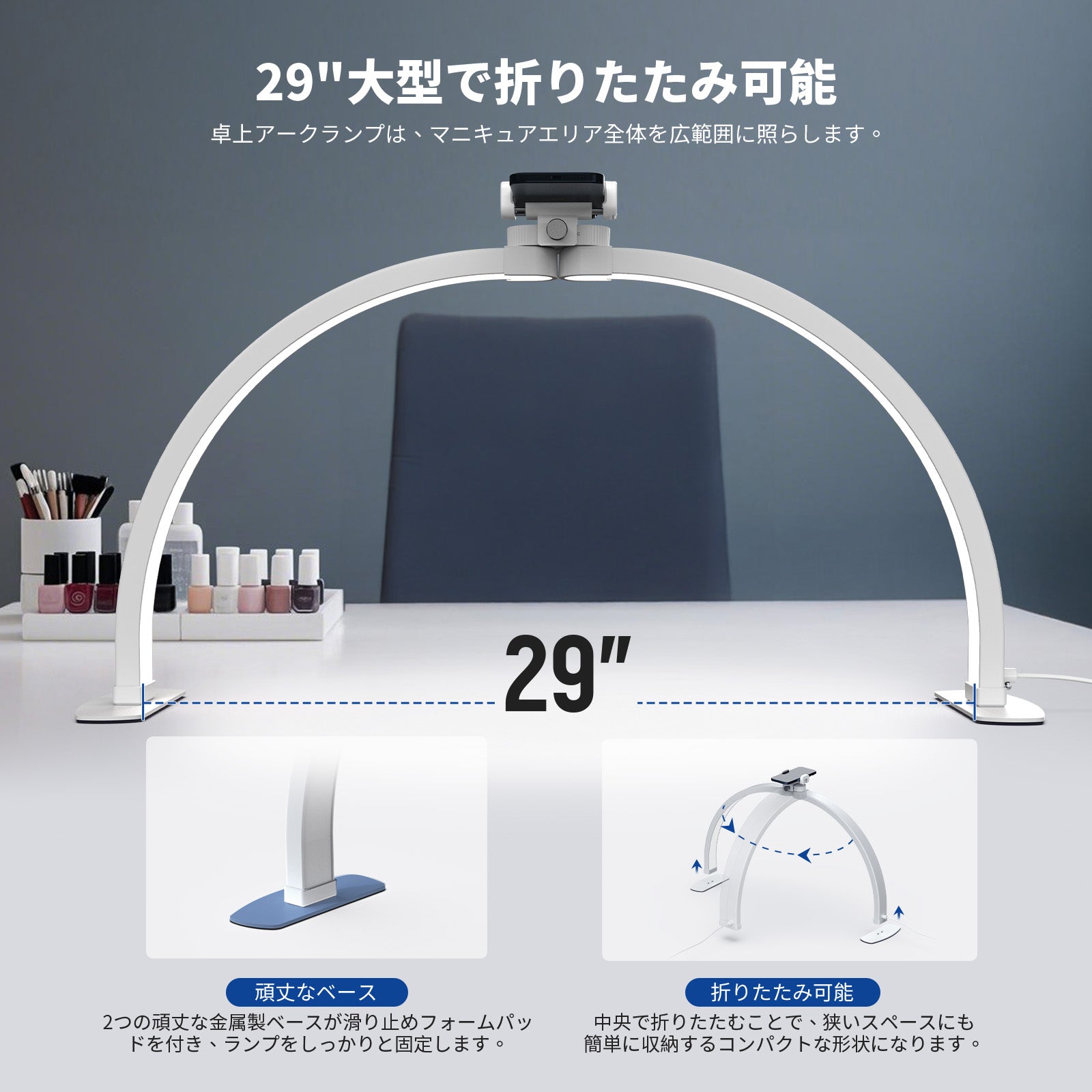 - 【重厚なベース付き29"大型折りたたみ式卓上ランプ】大型卓上アーク灯は直径738mm(29.1")で、マニキュアエリア全体を広く範囲に照らします。重厚な金属製ベースに滑り止めのフォームパッドが2つ付き、ランプをしっかりと固定し、ぐらつきのない安定した照明を実現します。大型サイズながら、中央で折りたたむことでコンパクトな形状になり、狭いスペースにも簡単に収まり、収納や持ち運びも便利です。