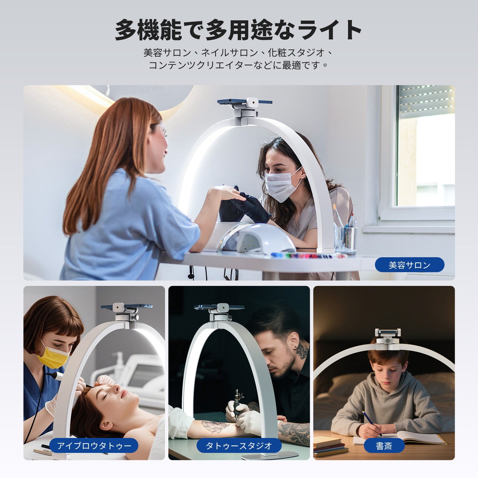 - 【多機能LED卓上ライト】多機能LEDハーフリングハローランプは、スマホホルダーマウントを備え、美容室、ネイルルーム、化粧スタジオなど、コンテンツクリエイターにとって必要なツールで、マニキュア、化粧、まつげエクステ、タトゥー、チュートリアル写真や録画など、様々な作業に最適なキーライトとフィルライトです。インフルエンサーやストリーマーにとってプロなネイルテックビデオや生放送の撮影、俯瞰撮影に最適です。