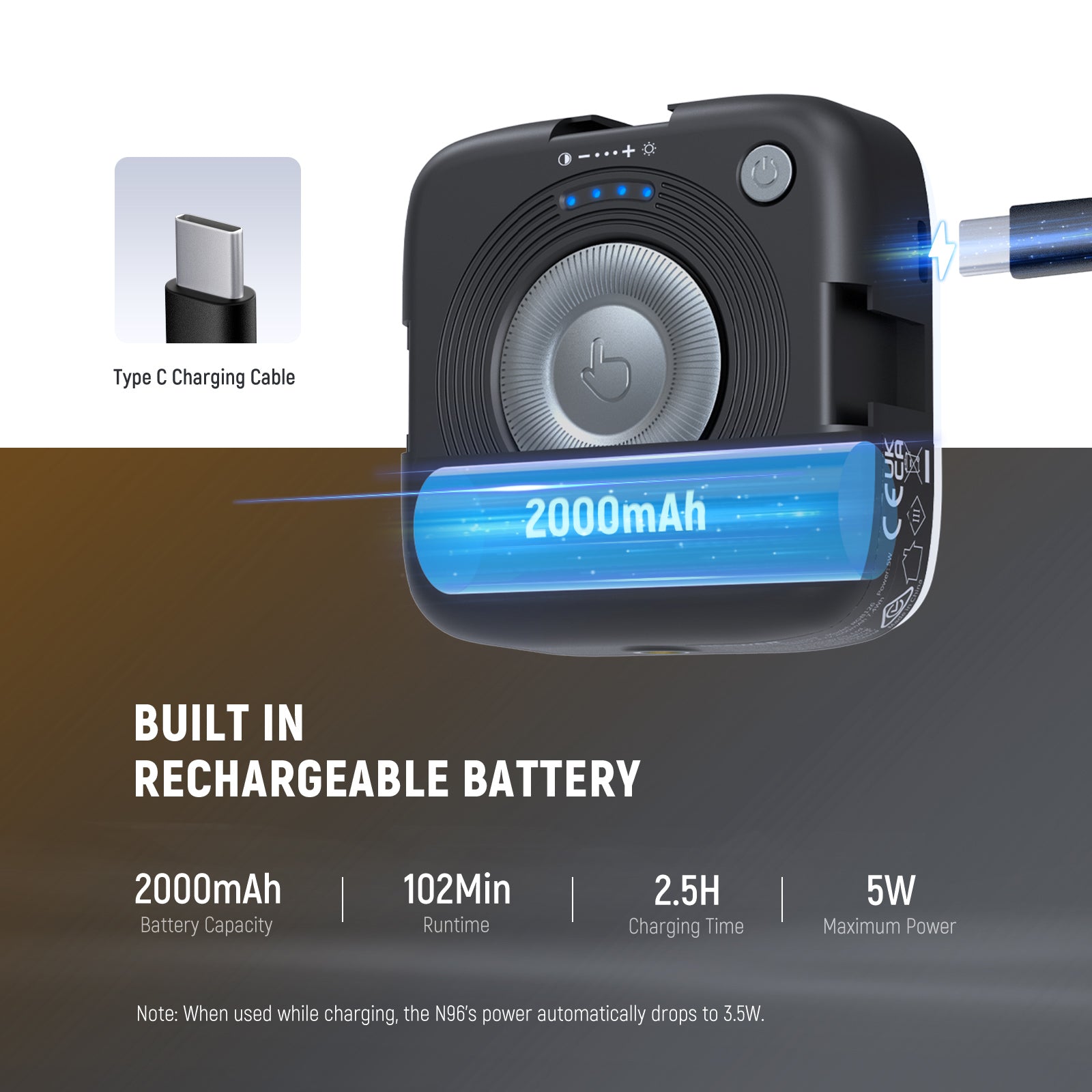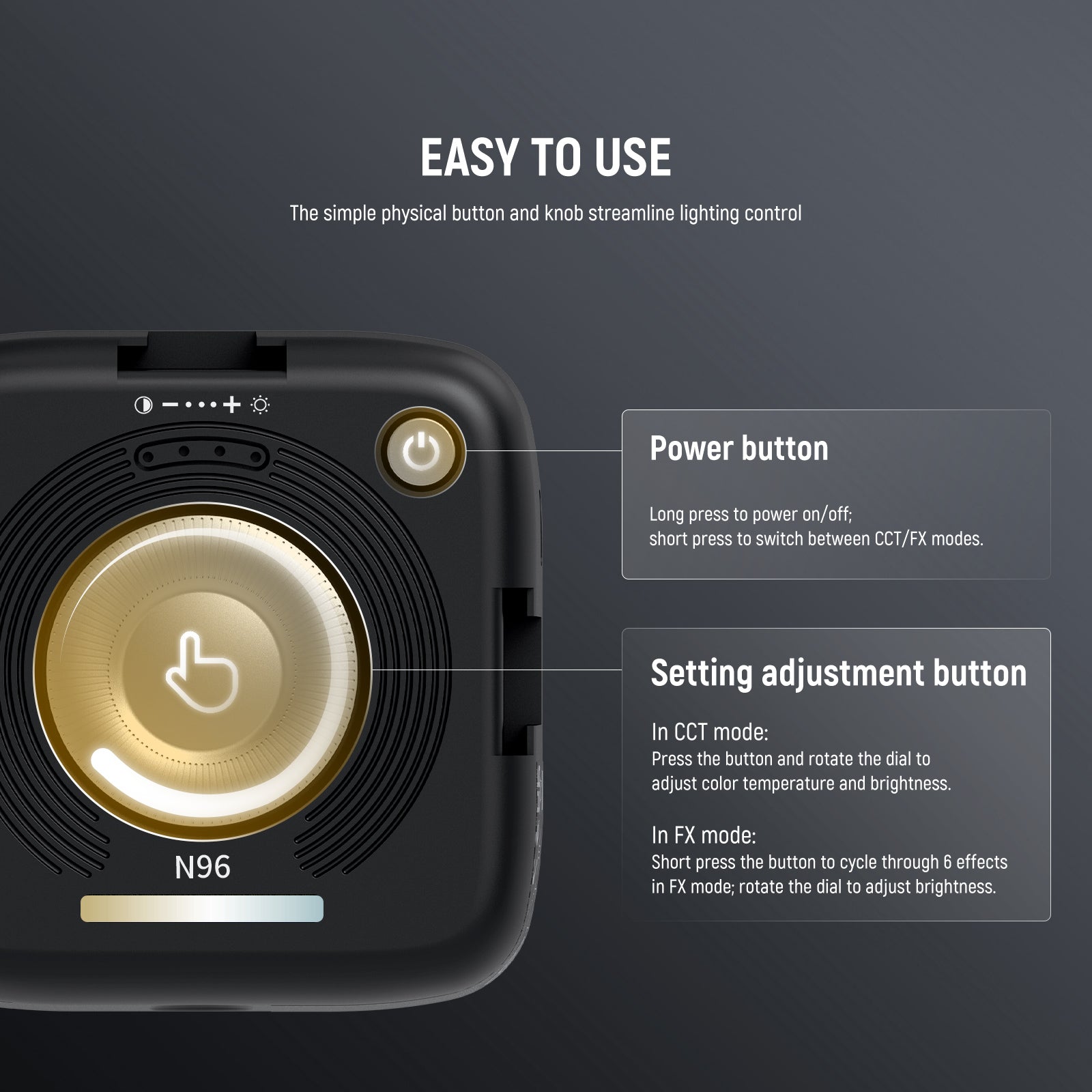- 【コンパクト&ポータブル】N96は、ポケットサイズのミニLEDパネルライトです。サイズは76x76x35mm、ディフューザー込みでわずか108gです。ノートパソコンにクランプで固定したり、マグネットで取り付けてキーライトや補助照明として美しい瞬間を捉えます。シンプルなボタンとノブで照明操作を効率化になり、ソーシャルメディアコンテンツクリエイター、化粧師、ライブストリーマー、インフルエンサーにとって必要な機材であり、自撮りライトとしても活躍します。