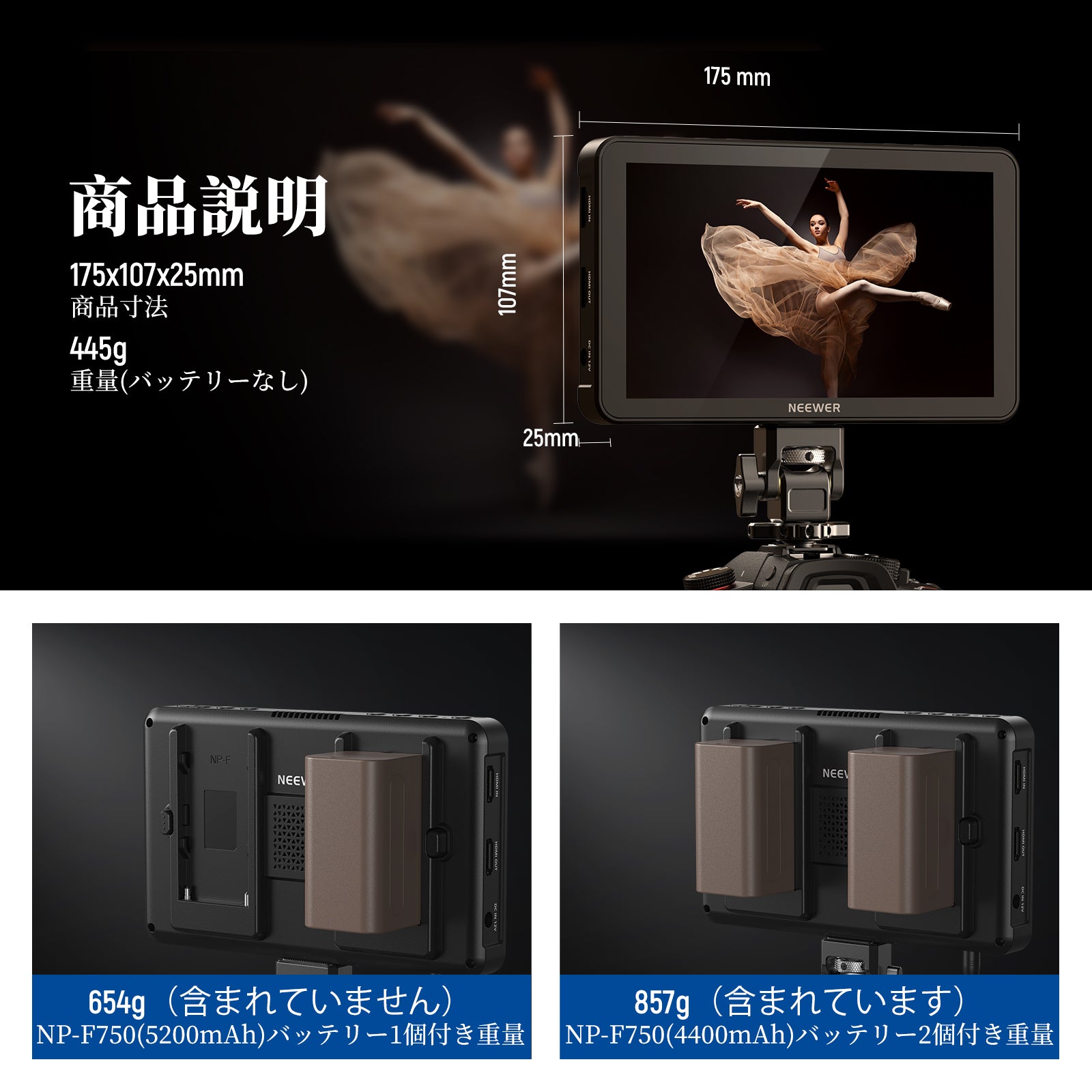 - 【多彩な電源オプション】DSLRモニターはNP-Fバッテリー(NP-F550/750/970)、DCポート(ケーブル別売)、Type C充電に対応しています。2つの4400mAh NP-F750バッテリーは、それぞれ2.4時間、合計4.8時間の駆動時間を提供し、5V/3A以上の急速充電器またはポータブル充電器(3A出力)と付属のUSB - Type Cケーブルを使用して充電できます。また、モニターはDC8V/1.5A出力によりカメラのダミーバッテリーとしても機能し、長時間の屋外撮影にも対応します。