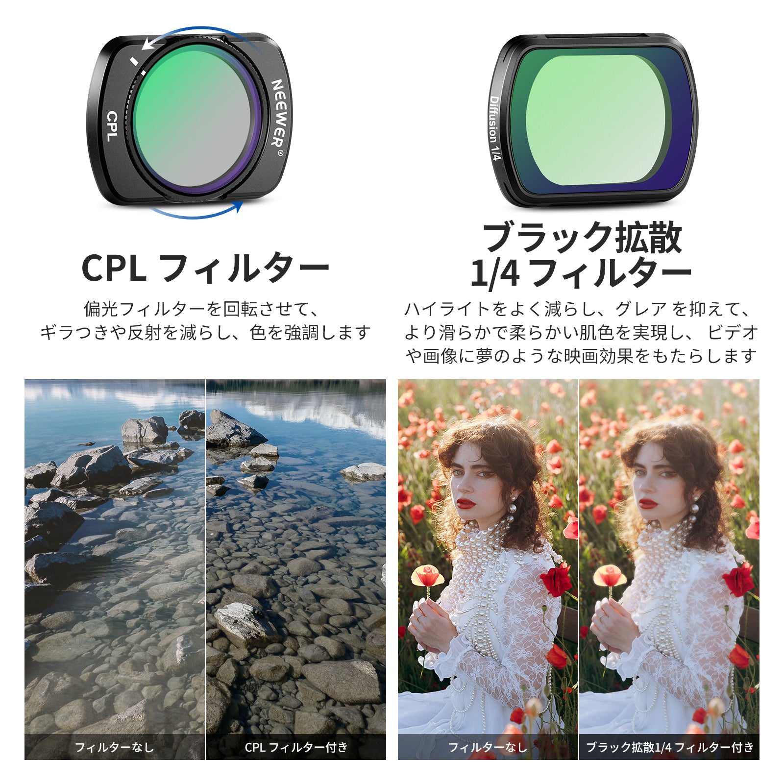 - 【露出と色を制御し、ソフトな効果を得る】4つのNDフィルターが4、5、6、8ストップ減光し、明るい環境での露出オーバーを防ぎ、低速シャッターや広い絞りでダイナミックなモーションブラーを撮影できます。円偏光フィルターは、非金属表面の反射を除去し、彩度とコントラストを高めます。ブラック拡散1/4フィルターは、ソフトでドリーミーな効果を生み出します。