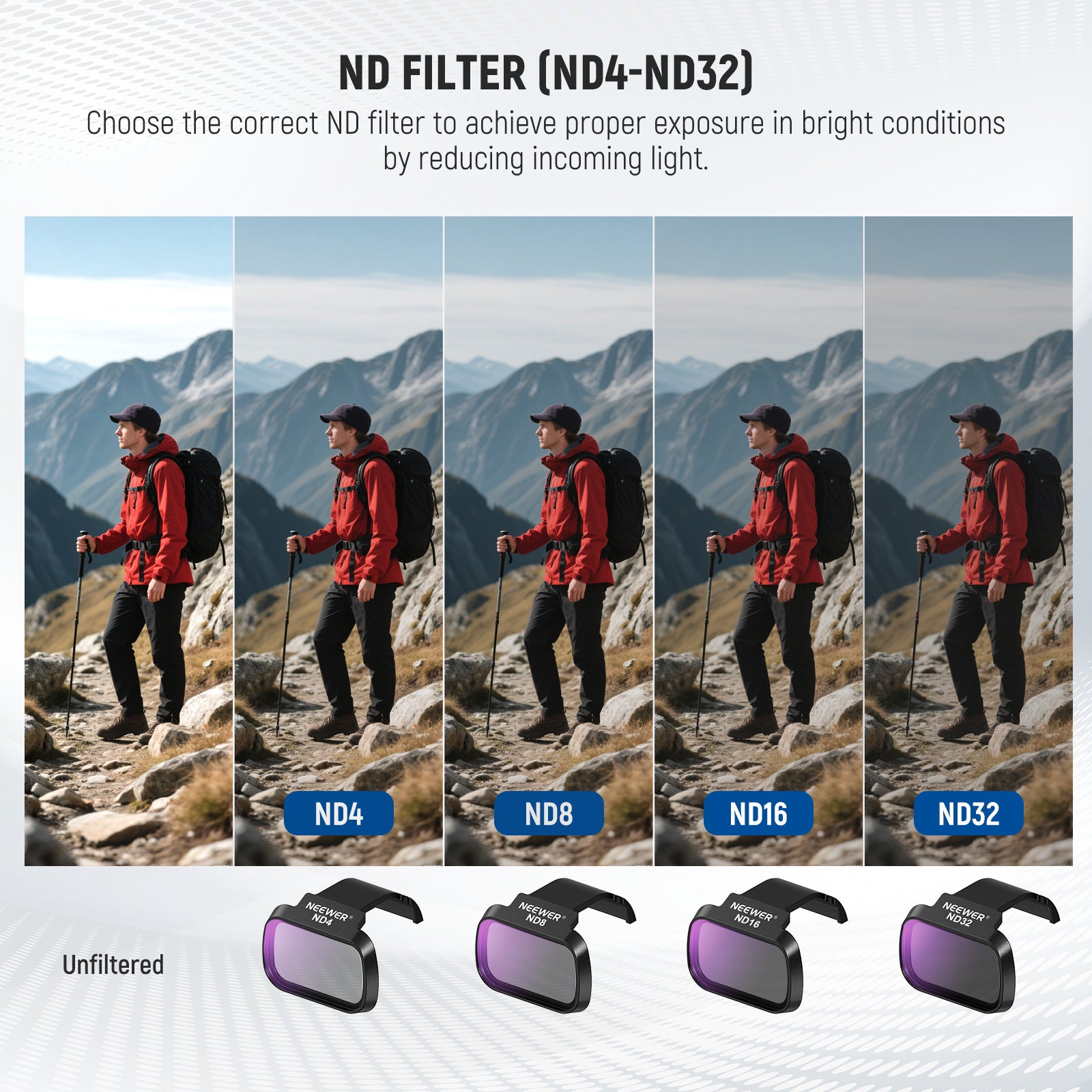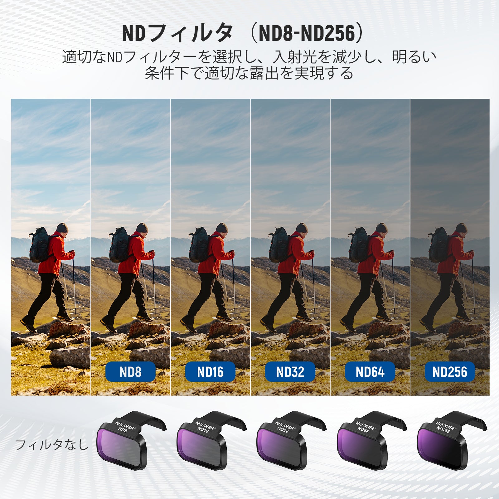 - 【優れた屋外撮影に露出バランス】ND8、ND16、ND32、ND64、ND256ドローンカメラフィルターは、それぞれ3、4、5、6、8ストップの減光オプションを提供します。これらのフィルターは、より低速シャッタースピードのために効果的に光の取り込みを制御し、さまざまな日照条件下での露出オーバーを防ぎ、空撮のようなダイナミックな屋外活動中に壮大な映像を撮影するための映画のようなモーションブラーに貢献します。
