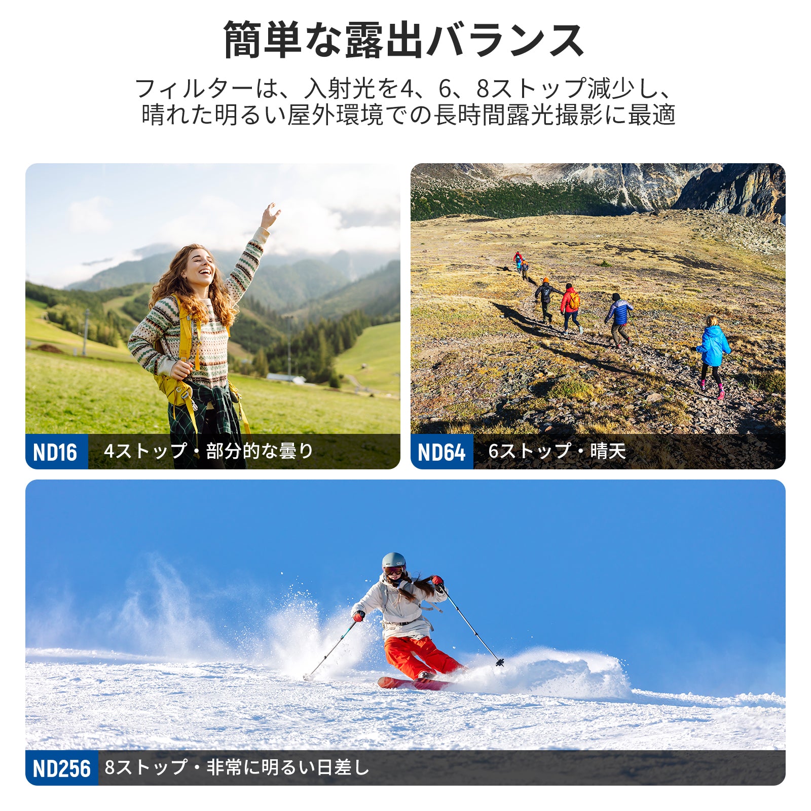 - 【簡単な露出バランス】ND16、ND64、ND256フィルターは、それぞれ4、6、8ストップ減光し、明るい屋外での長時間露光撮影に適しています。これらのフィルターにより、絞りを大きくして低速シャッター スピードで撮影し、表現力豊かなモーション ブラー効果で動きを捉えることができます。